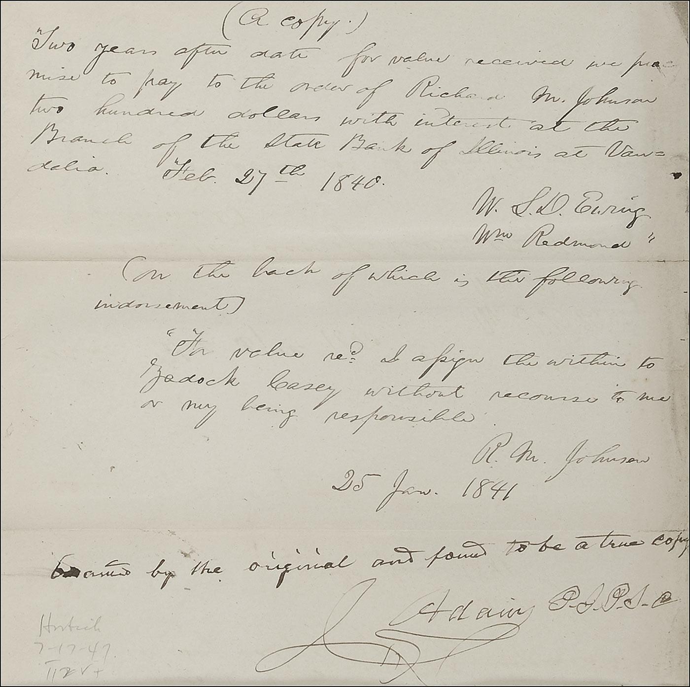 Autograph document, one page, 8.5 x 8.5, no date. Once part of a larger document, labeled “A Copy,” in Lincoln’s hand, of a February 1840 promissory note for $200 which was to have been paid “with interest at the branch of the State Bank of Illinois at Vandalia.” Document continues “’For value recd I assign the within to Zadcock Casey without recourse to me or my being responsible.” Matted with a CDV portrait of Lincoln, to an overall size of 13.5 x 17.5. In very good condition, with two horizontal folds, scattered toning, soiling, and creasing, a few small edge tears, and some light pencil notations to lower left. Accompanied by a typescript on Lincoln Library, Shippensburg, Pennsylvania, letterhead. Over sixty-five words in Lincoln’s hand.