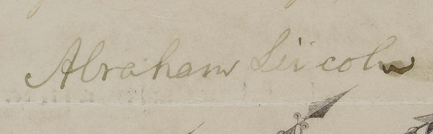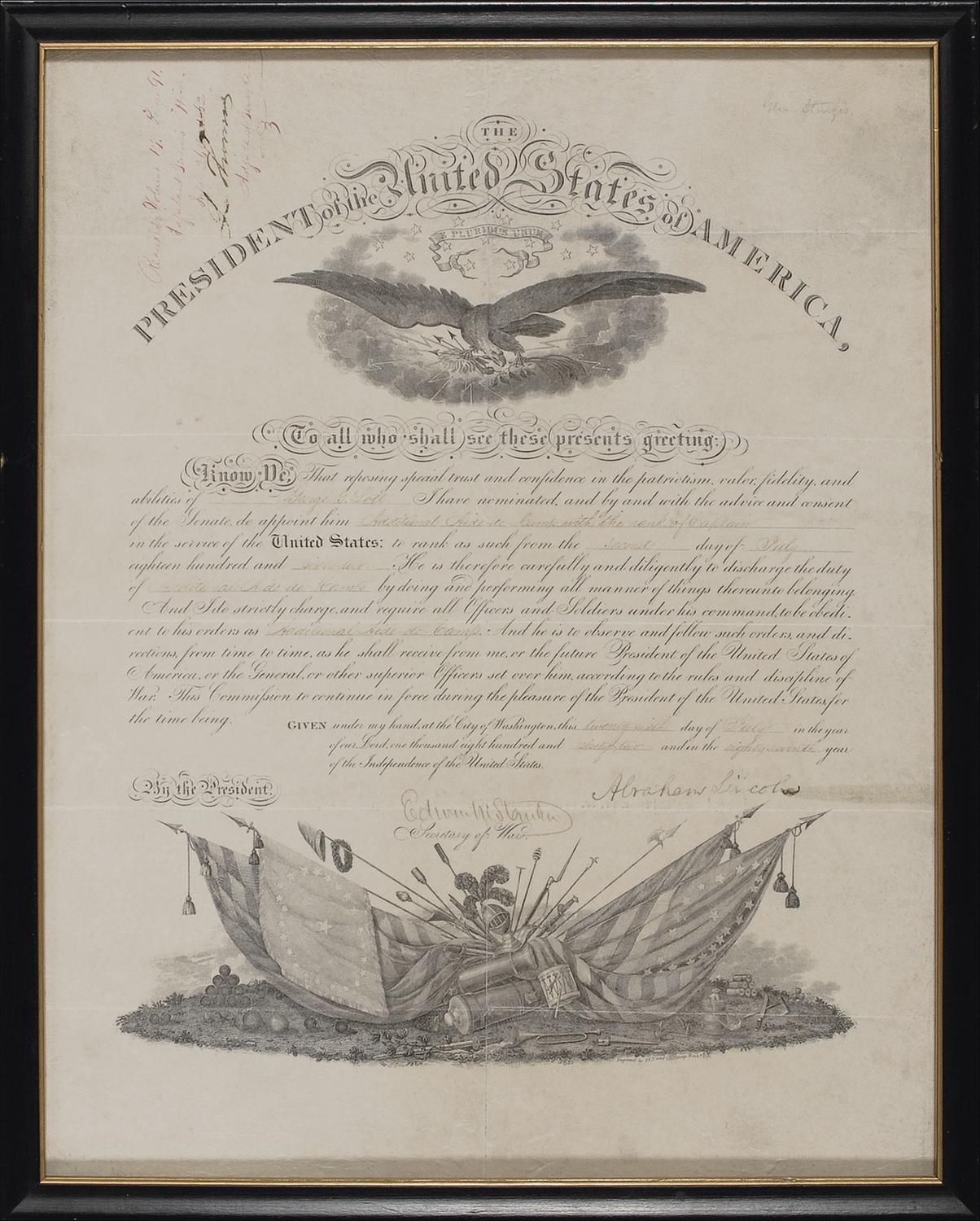 Partly-printed war-dated DS as president, one page, 15 x 19, July 26, 1862. President Lincoln appoints George G. Lott to the position of “Additional Aide-de-Camp with the rank of Captain.” Signed at the conclusion by Lincoln, and countersigned by Secretary of War Edwin Stanton. Document appears to have been mounted, and is framed to an overall size of 16.5 x 20.5. In very good to fine condition, with intersecting folds, written portions of document a few shades light, but completely legible, Lincoln’s signature a shade light, with last letter of signature darker from a water stain impinging from the right side, and light bubbling to several areas from mounting.