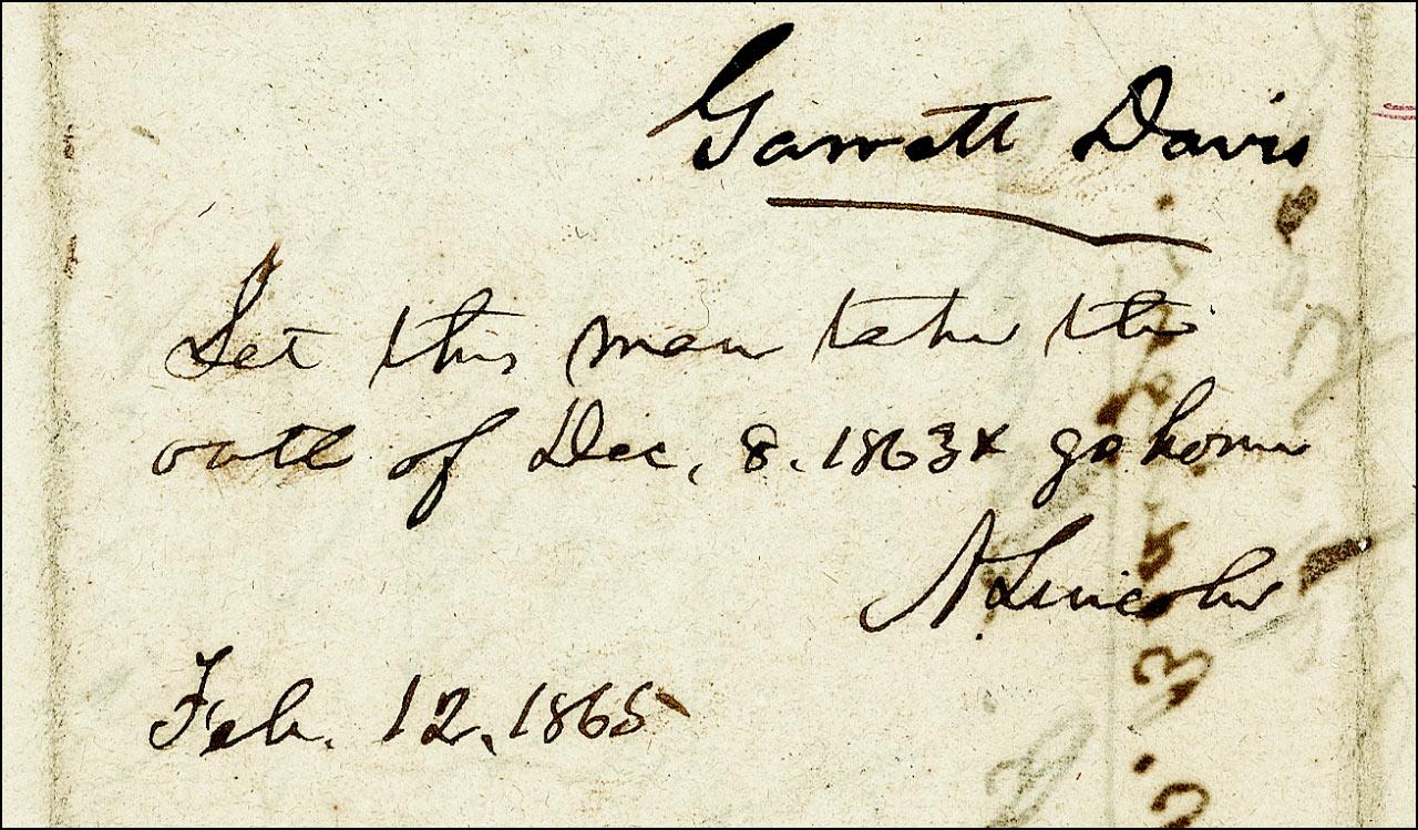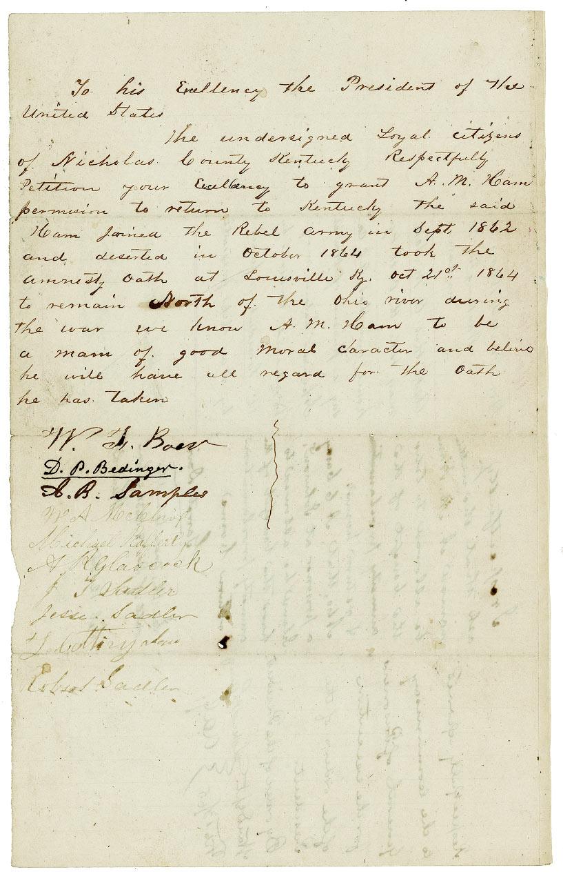 War-dated handwritten endorsement as president, “Let this man take the oath of Dec. 8, 1863 & go home. A. Lincoln. Feb. 12, 1865,” on the reverse of a letter sent to Lincoln, signed by ten Kentuckians including D. P. Bedinger, A. B. Samples, A. R. Glascock, Jesse Sadler, and Robert Sadler, requesting permission for a Confederate deserter to return home to Kentucky. The letter reads, “The undersigned Loyal citizens of Nicholas County Kentucky Respectfully Petition your Excellency to grant A. M. Ham permission to return to Kentucky the said Ham joined the Rebel Army in Sept. 1862 and deserted in October 1864 took the amnesty oath at Louisville Ky. Oct 21st 1864 to remain North of the Ohio river during the war we know A.M. Ham to be a man of good moral character and belive [sic] he will have all regard for the Oath he has taken.”