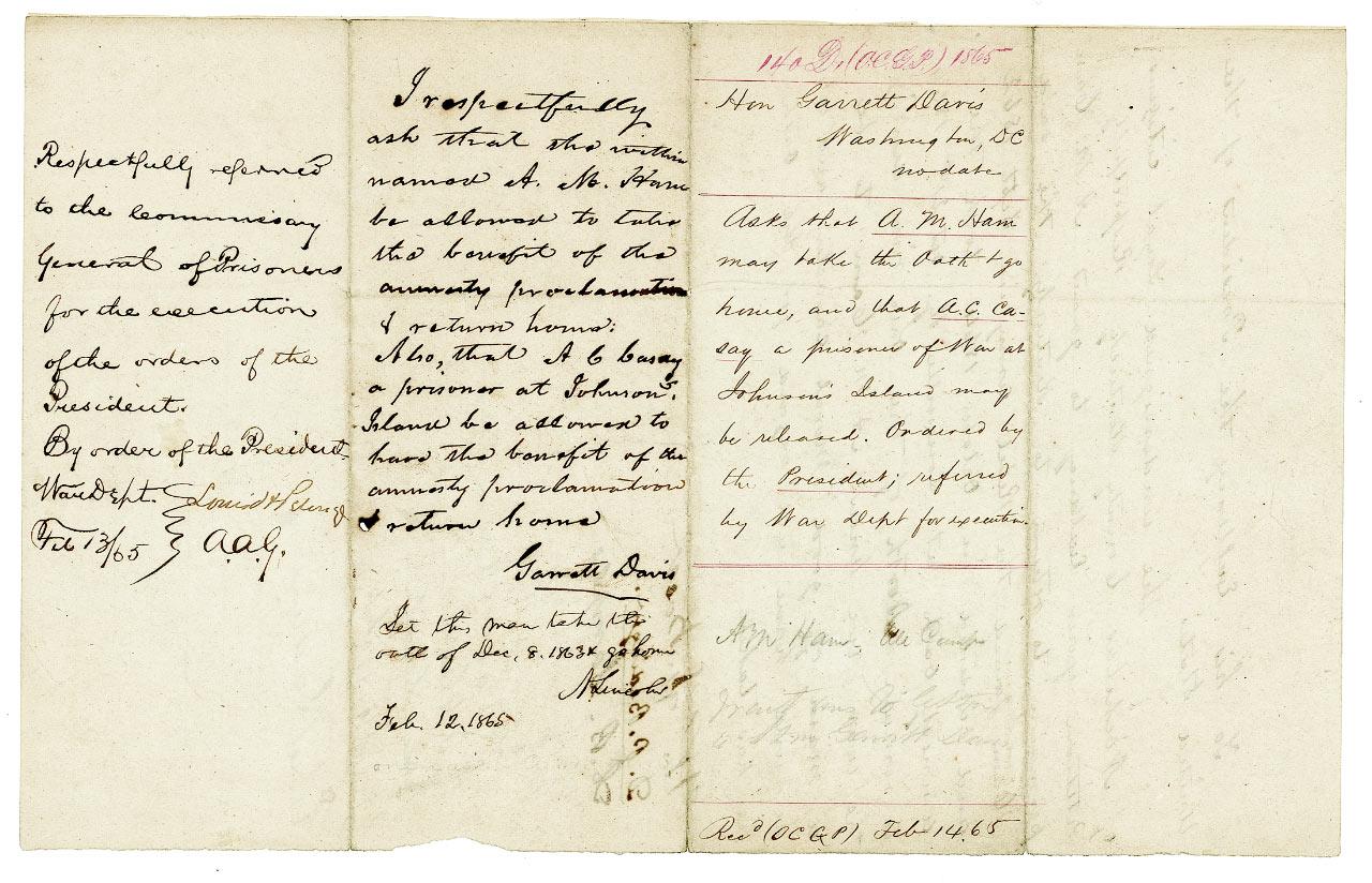 Reverse of the letter also bears an endorsement by Senator Garrett Davis, directly above Lincoln’s, which reads, “I respectfully ask that the within named A. M. Ham be allowed to take the benefit of the amnesty proclamation & return home. Also, that A C Casay [or Casey] a prisoner at Johnson’s Island be allowed to have the benefit of the amnesty proclamation & return home. Garrett Davis.” Left panel of reverse of letter bears a manuscript endorsement signed by Colonel Louis H. Pelouze, Assistant Adjutant General. Endorsement reads, “Respectfully referred to the Commissary General of Prisoners for the execution of the orders of the President. By order of the President. War Dept. Feb. 13/65.” In the right column, Pres. Lincoln’s private secretary, John Hay, has penned: “Hon. Garrett Davis, Washington, DC, no date. Asks that A. M. Ham may take the Oath & go home, and that A. C. Casay a prisoner at Johnson’s Island may be released. Ordered by the President; referred by War Dept for execution.” In very good condition, with show-through from writing on the reverse lightly affecting a portion of Lincoln’s signature and endorsement, a couple small spots of ink erosion, paper loss along bottom edge, and some scattered light toning and soiling.