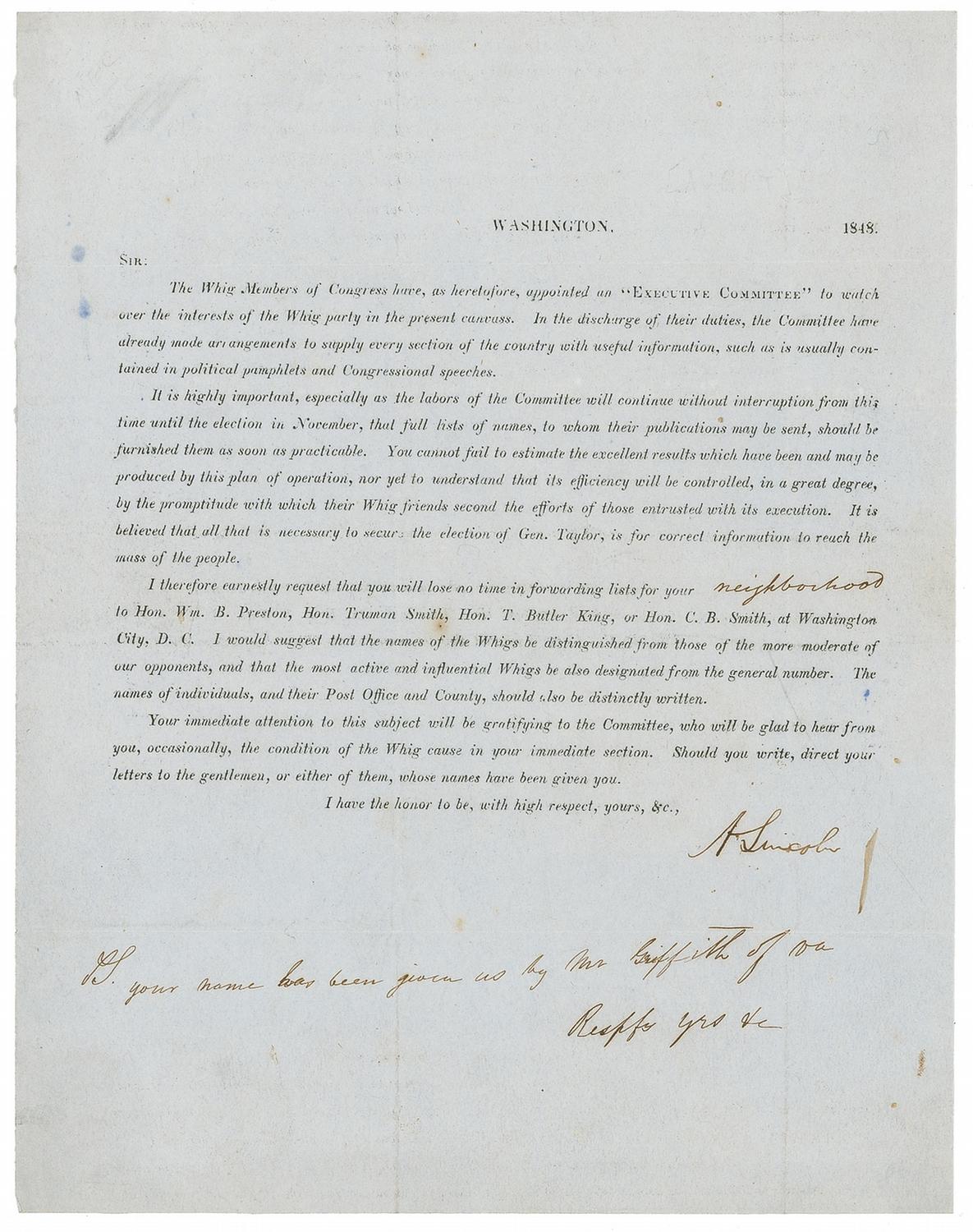 Your immediate attention to this subject will be gratifying to the Committee, who will be glad to hear from you, occasionally, the condition of the Whig cause in your immediate section. Should you write, direct your letters to the gentleman, or either of them, whose names have been given you.” Beneath Lincoln’s signature is a postscript in another hand: “Your name has been us by Mr Griffith of VA.”