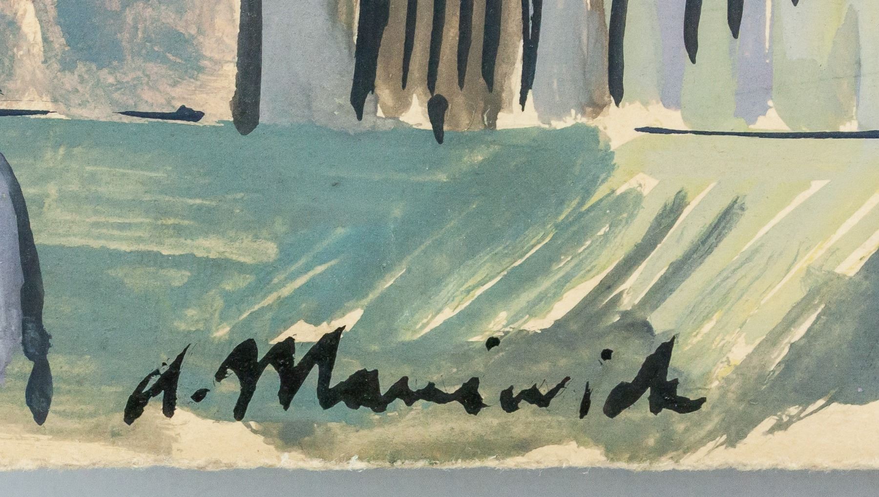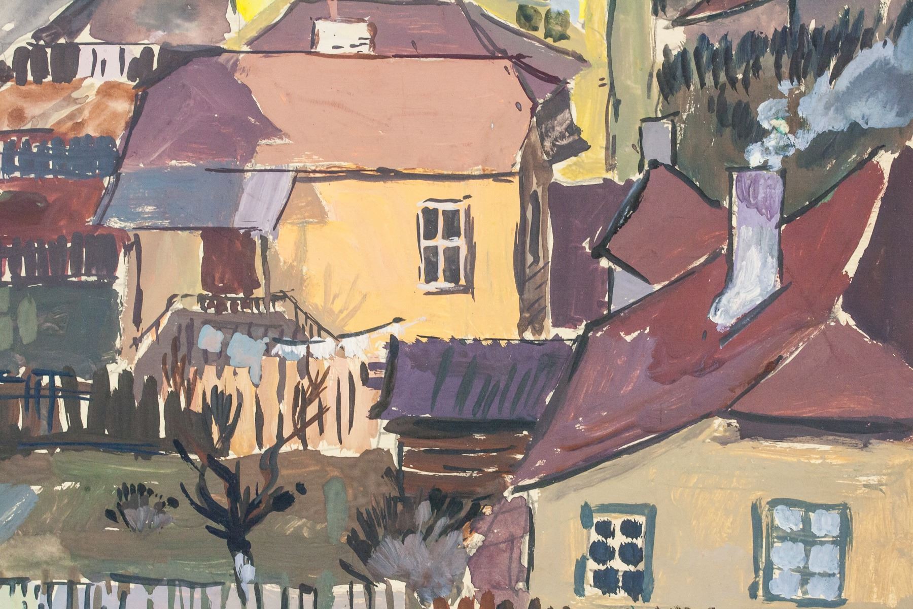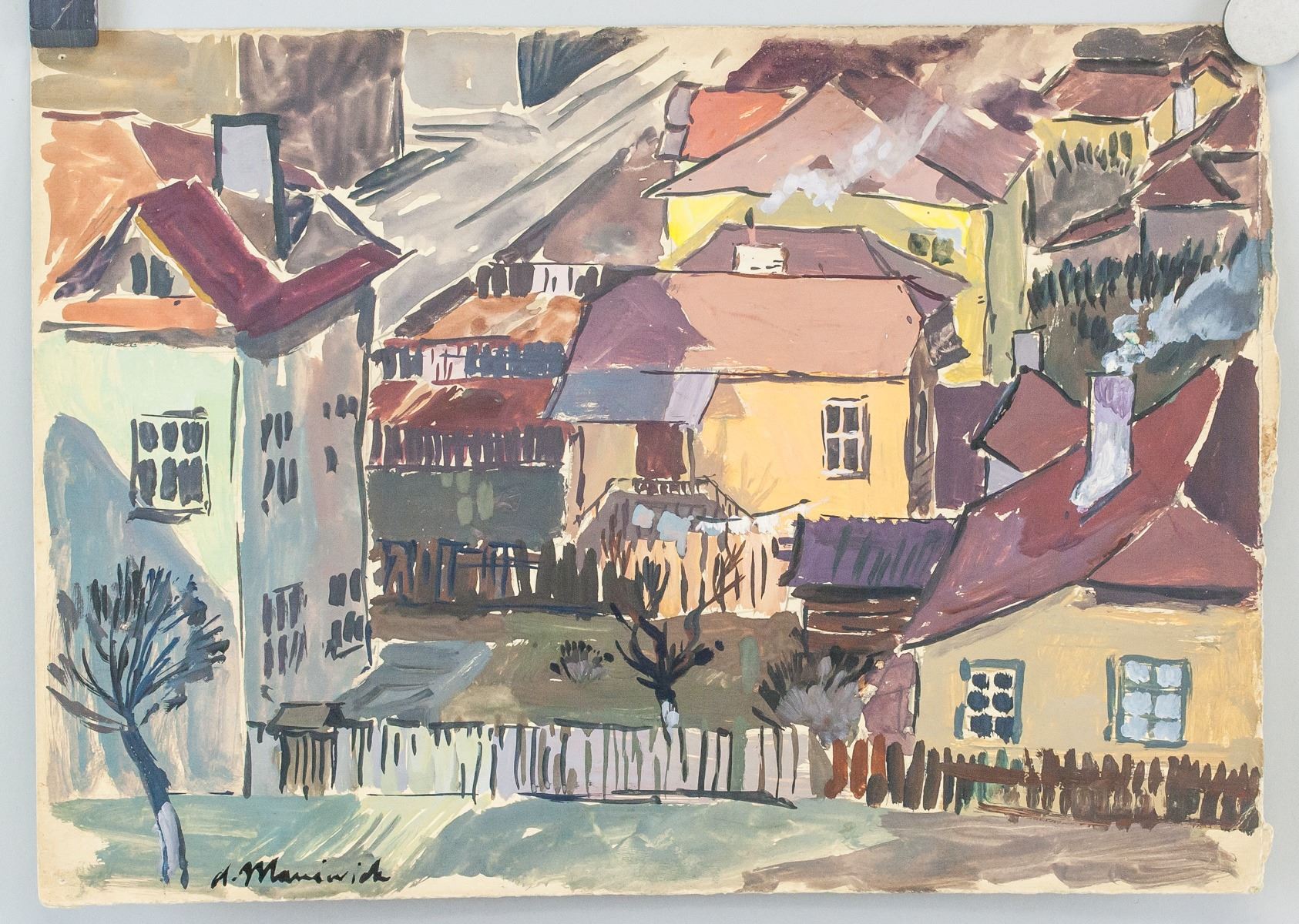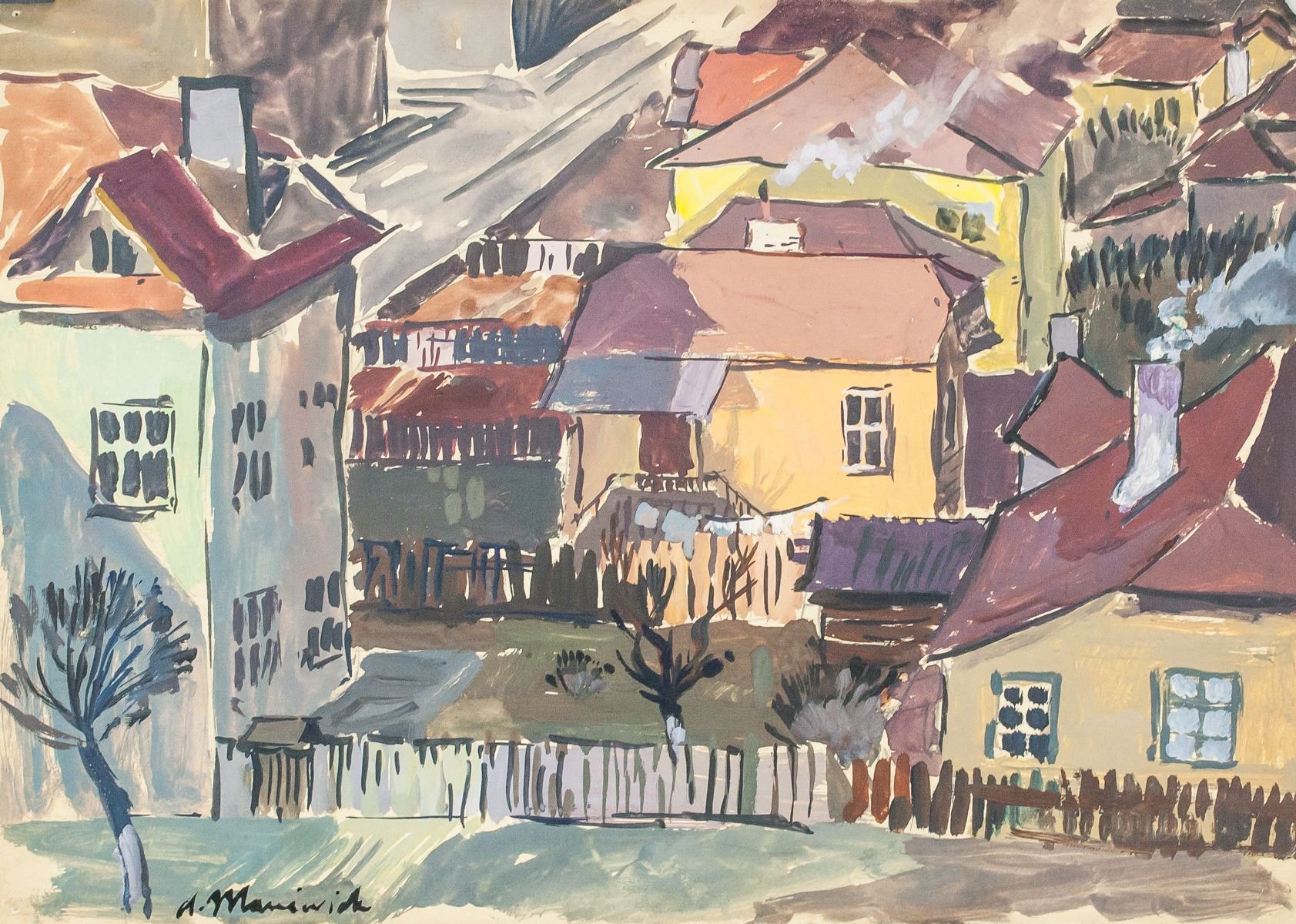 Gouache on paper. Featuring a landscape scene of homes. Signed A. Manievich on the lower left corner. Attributed to Abraham Manievich (1883-1942, Russian-American). 25 x 36 cm (10 x 14 inches). Provenance: This lot carries limited provenance from a Southern Ontario estate