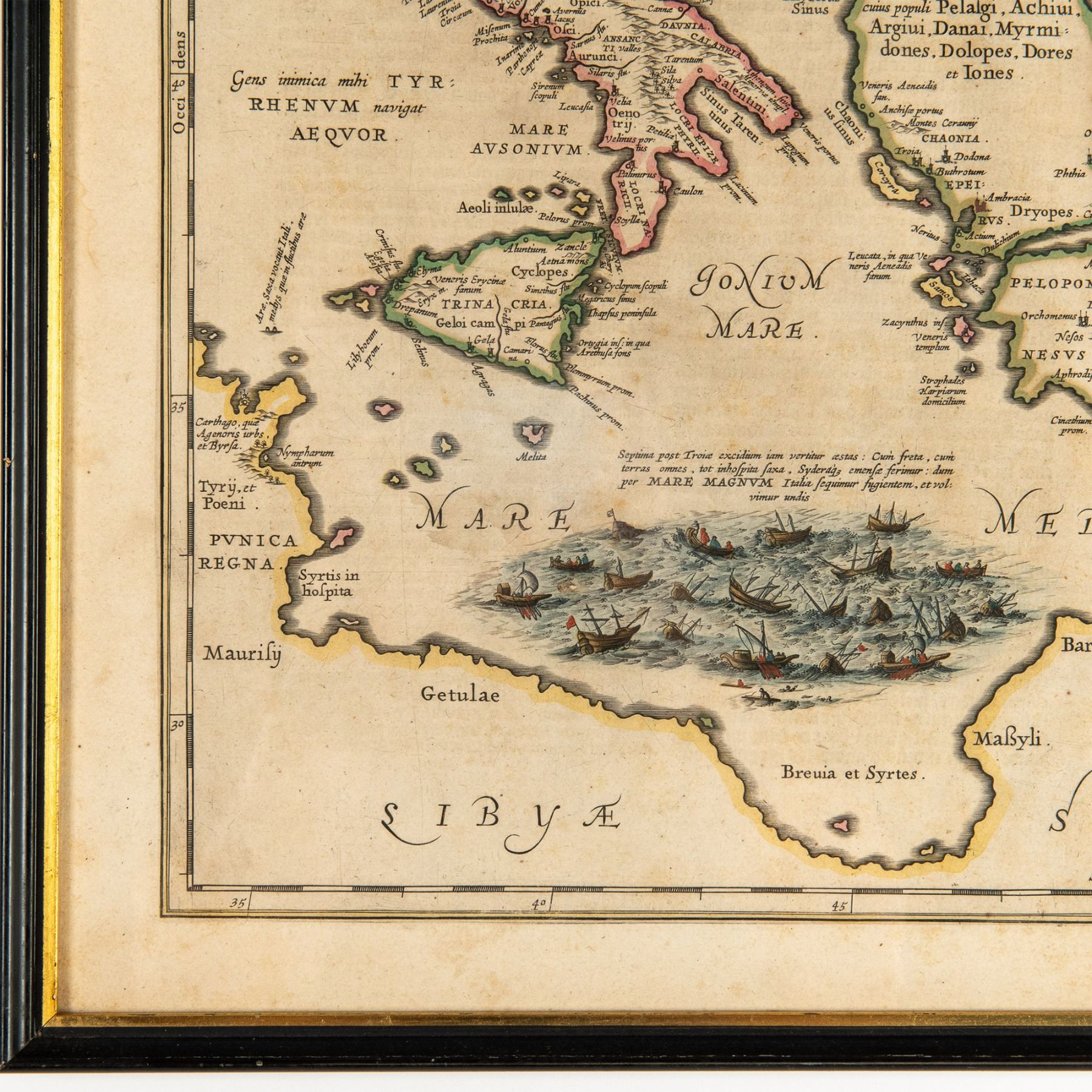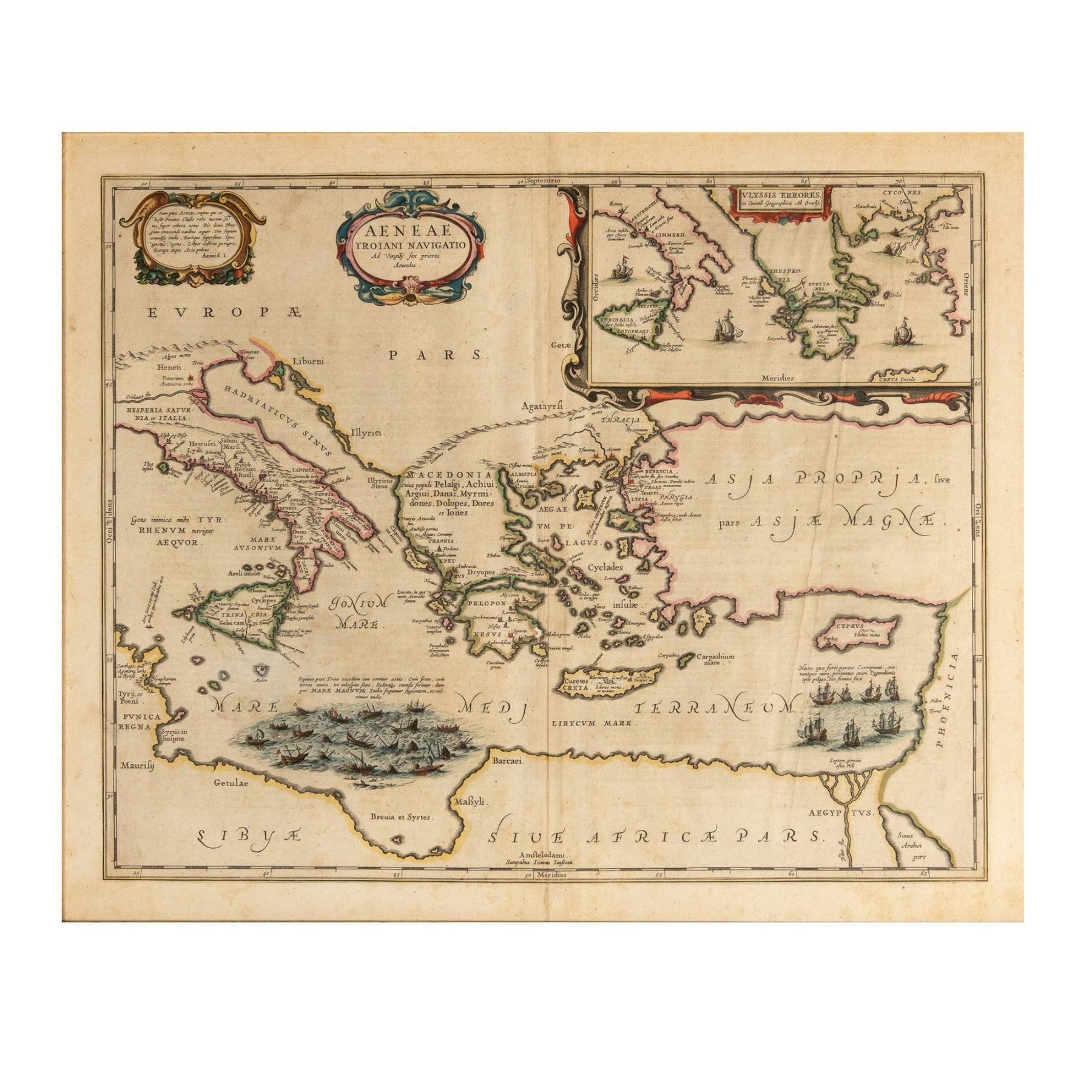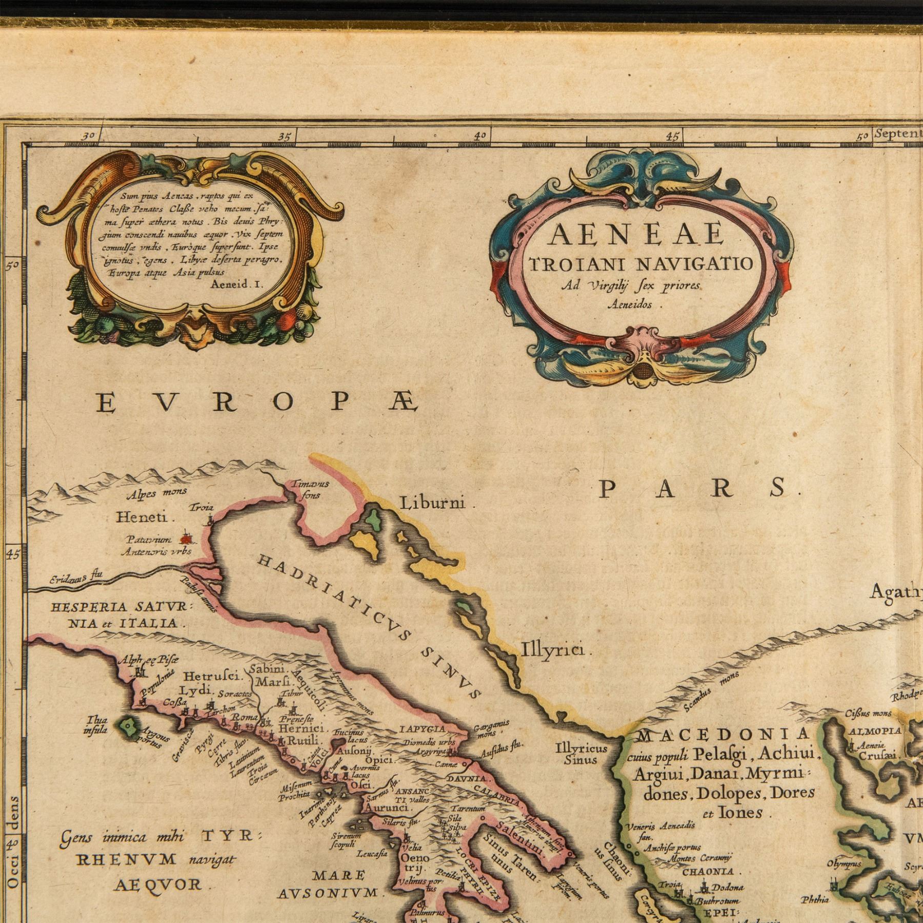 Original antique partial hand-colored engraving on paper folio map of Parergon by one of the most influential cartographers of the 16th century, Abraham Ortelius. Ortelius folio map is from the Theatrum Orbis Terrarum - Parergon - Nomenclator Ptolemaicus, first published in Antwerp in 1570. Title in cartouche: Aeneae Troiani Navigatio. Sticker on verso: Thomas Co. Picture Framing, Washington D.C. Housed in a gilded frame. Sight size: 21.25"L x 17.25"H. Frame dimensions: 22.50"L x 18.50"H x 1"W. Artwork can be unframed and rolled for shipment.