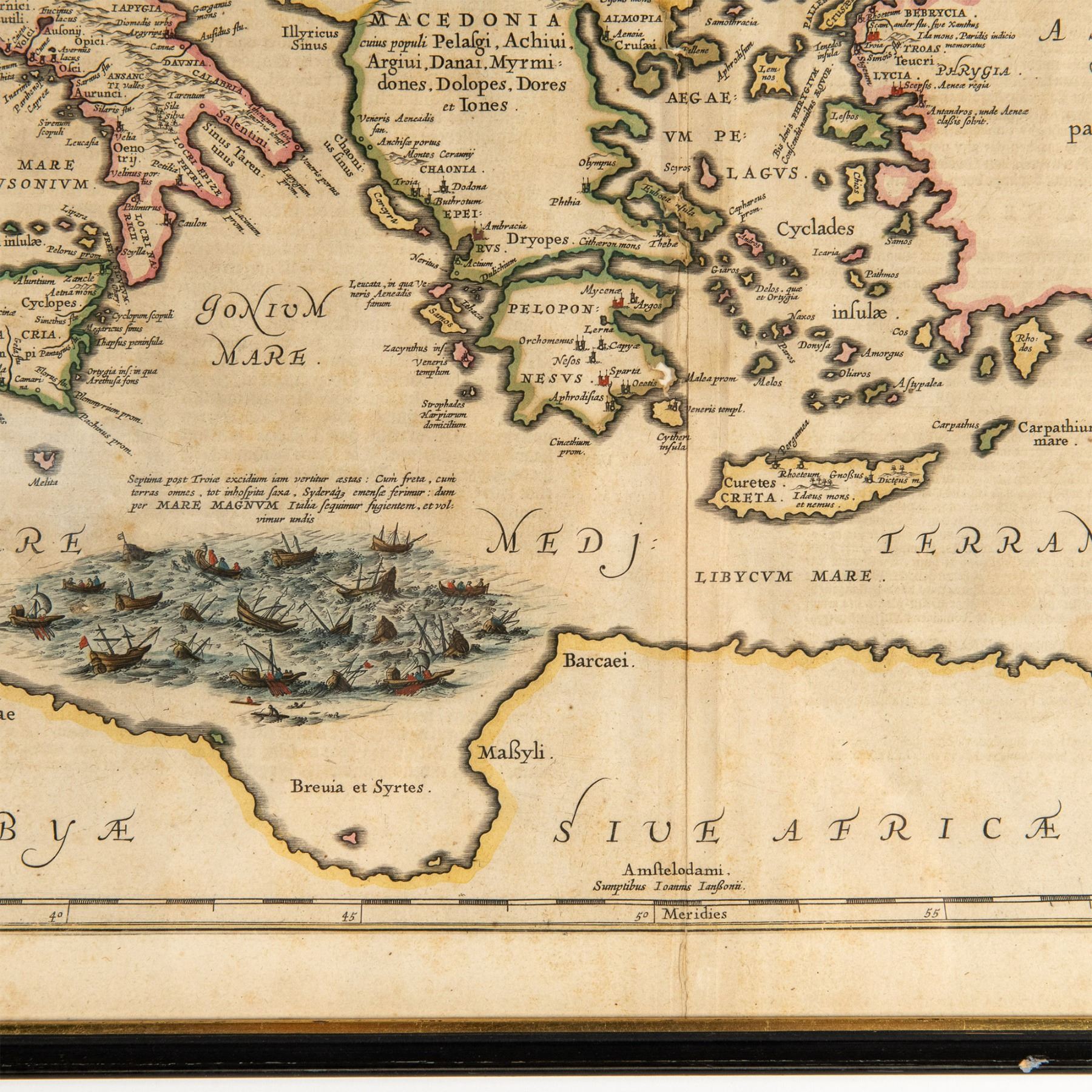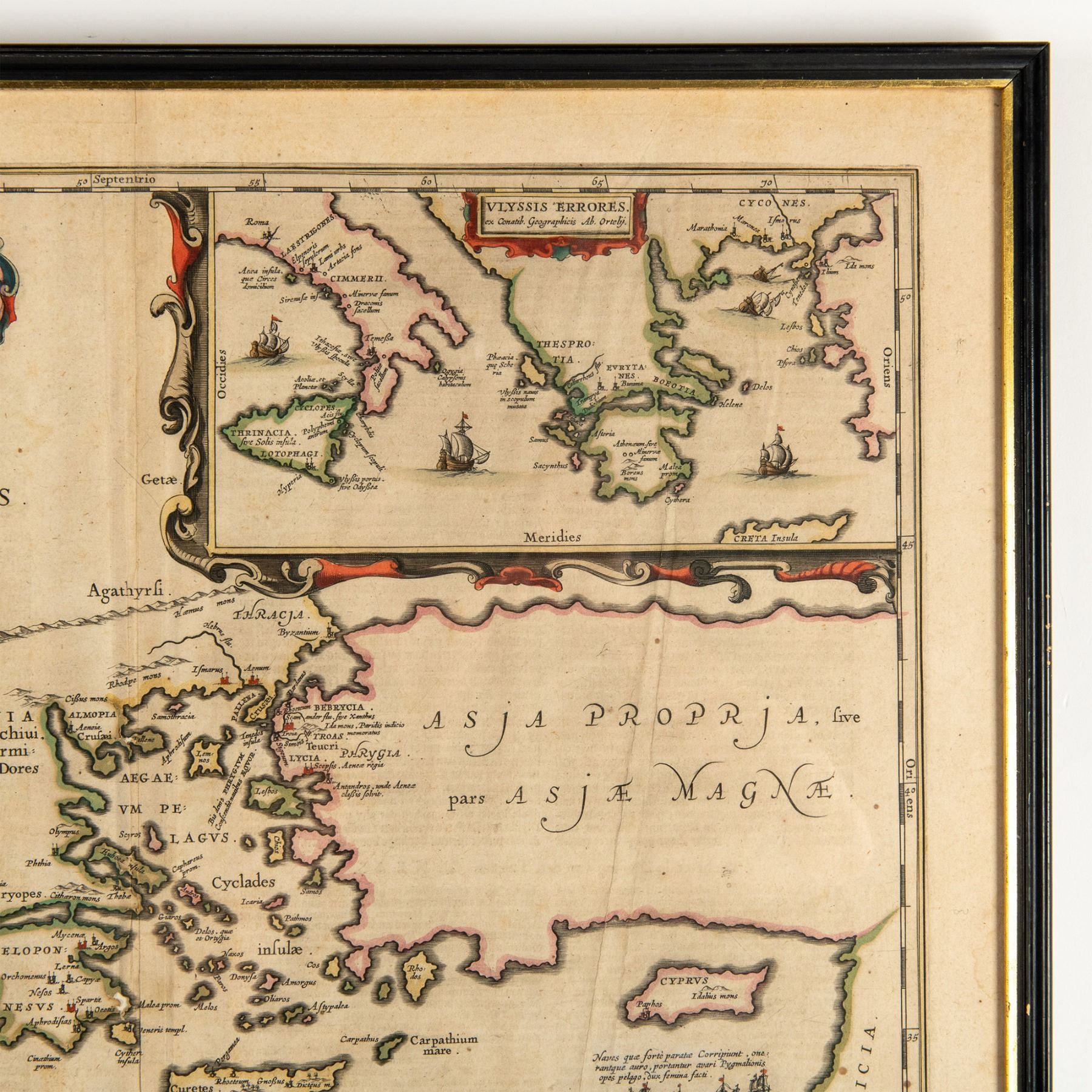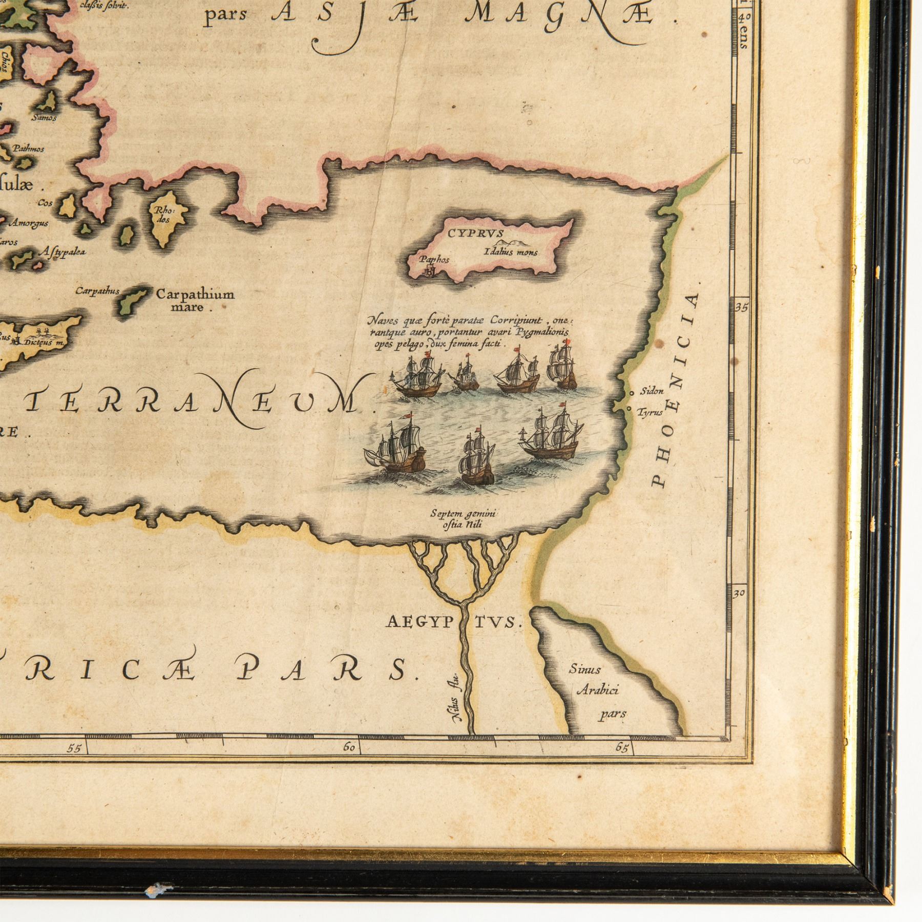 Original antique partial hand-colored engraving on paper folio map of Parergon by one of the most influential cartographers of the 16th century, Abraham Ortelius. Ortelius folio map is from the Theatrum Orbis Terrarum - Parergon - Nomenclator Ptolemaicus, first published in Antwerp in 1570. Title in cartouche: Aeneae Troiani Navigatio. Sticker on verso: Thomas Co. Picture Framing, Washington D.C. Housed in a gilded frame. Sight size: 21.25"L x 17.25"H. Frame dimensions: 22.50"L x 18.50"H x 1"W. Artwork can be unframed and rolled for shipment.