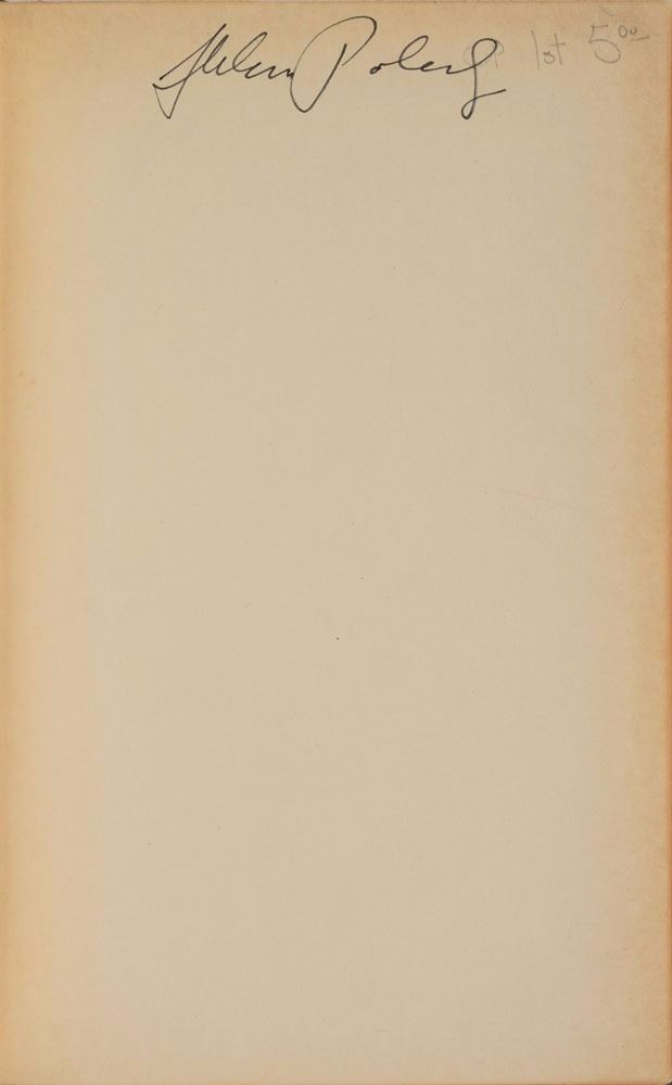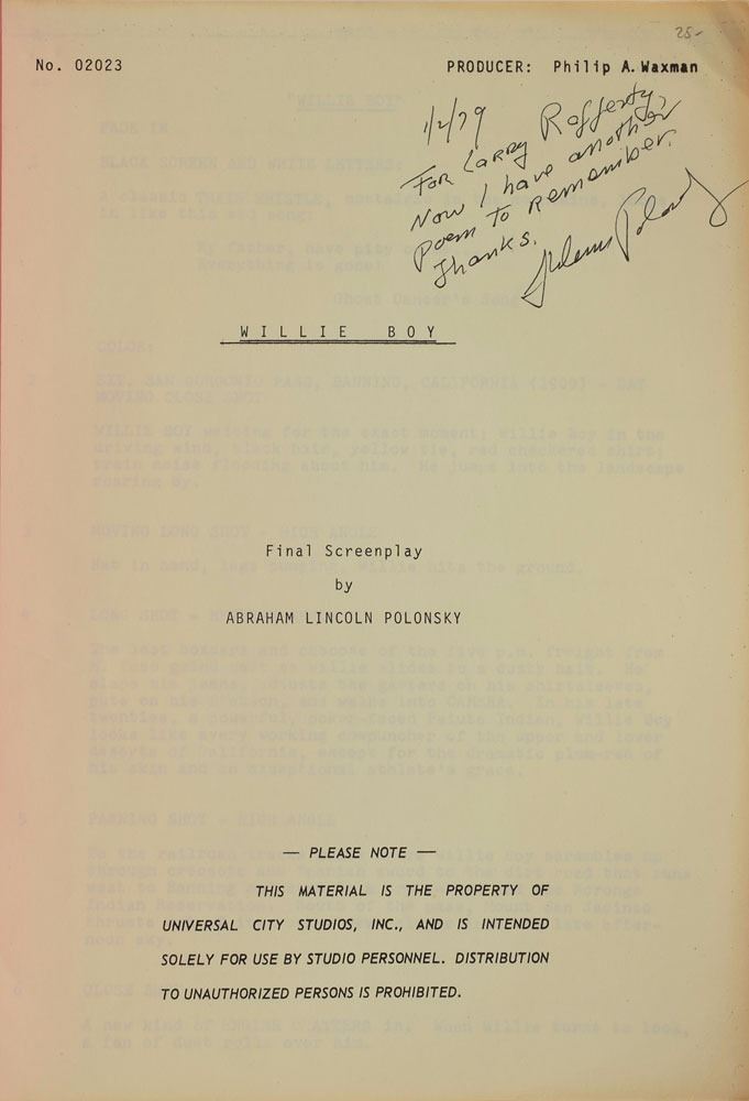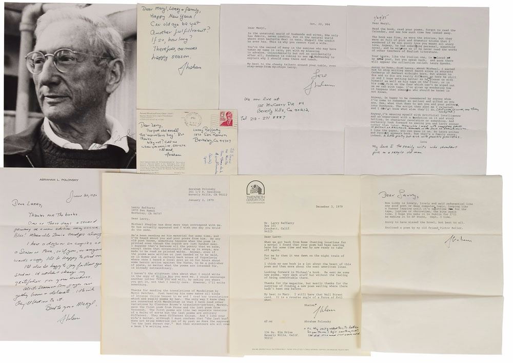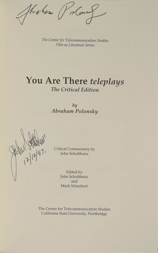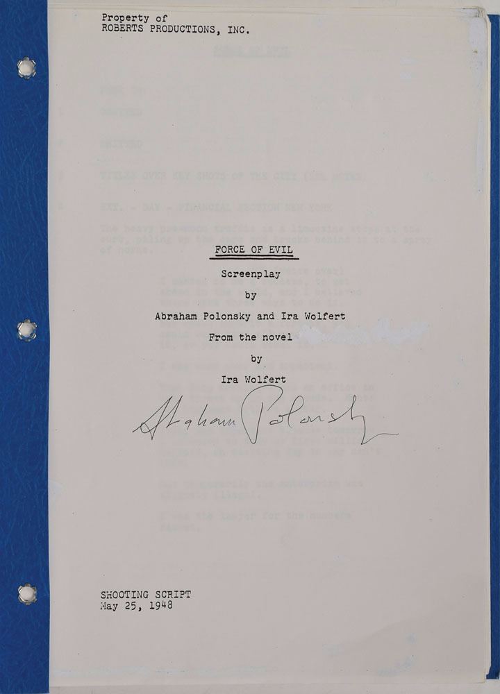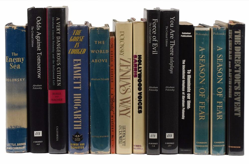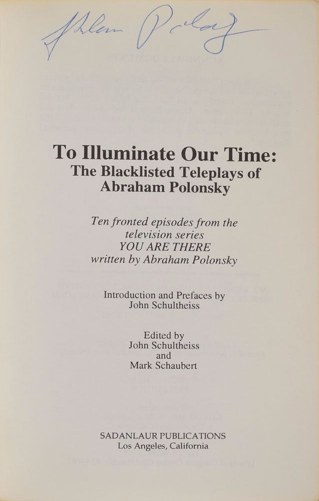 American film director, Academy Award–nominated screenwriter, essayist, and novelist (1910–1999) who was blacklisted by the Hollywood movie studios in the 1950s. Large collection of items signed by Polonsky, including thirteen signed first edition books and several signed letters and other materials. Books are signed on a free end page, half-title page, or title page, and include: The Goose Is Cooked (two: hardcover with dust jacket, and paperback); The Enemy Sea (hardcover with dust jacket); The World Above (hardcover with dust jacket); A Season of Fear (two: both hardcover with dust jacket); Zenia’s Way (hardcover with dust jacket); The Director’s Event (hardcover with dust jacket); Force of Evil: The Critical Edition (hardcover); Odds Against Tomorrow: The Critical Edition (hardcover); You Are There, Teleplays: The Critical Edition (hardcover); Hollywood Voices (hardcover with dust jacket); and To Illuminate Our Time (softcover). Additionally includes a softbound screenplay for Willie Boy, signed and inscribed on the first page by Polonsky; and a modern copy of the shooting script for Force of Evil, signed on the title page by Polonsky.