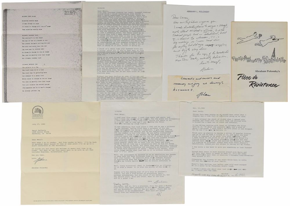 Other items signed by Polonsky include: an original 27 x 41 one-sheet movie poster for the 1948 crime film noir Force of Evil, archivally prepared and backed; a glossy 8 x 10 photo; an ANS on a postcard; an ANS on a New Year’s card; three hand-annotated unsigned typed letters; two ALSs; six TLSs; and a brief autograph quote, “Laments and curses and memory and joy are always hosannas, Abraham.” Many of the letters discuss books and literature. One letter, in part: "As any old poet knows, something happens when the poem is printed even though the copies are just handed away. I suppose that's because all the poetry that we know, except those that occasionally show up in songs, are made to be read as printed words. Anyway, even if the poems were written or just handed on to be said, a sin Homer and in certain back areas of Yugoslavia where once I heard a local poet go on for hours about some heroic action against the Turks, to be a publisher of poets, no matter what the poems are intended for, is already extraordinary." Also includes an unsigned copy of A Very Dangerous Citizen, and two programs for Piece de Resistance. In overall very good to fine condition, with general wear to books and some repaired tears and paper loss to the poster.