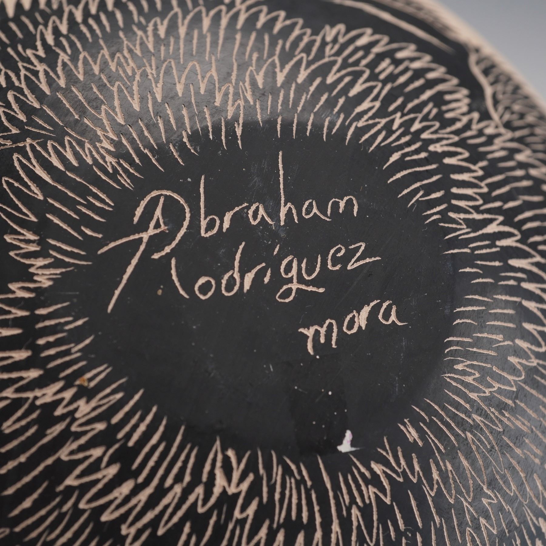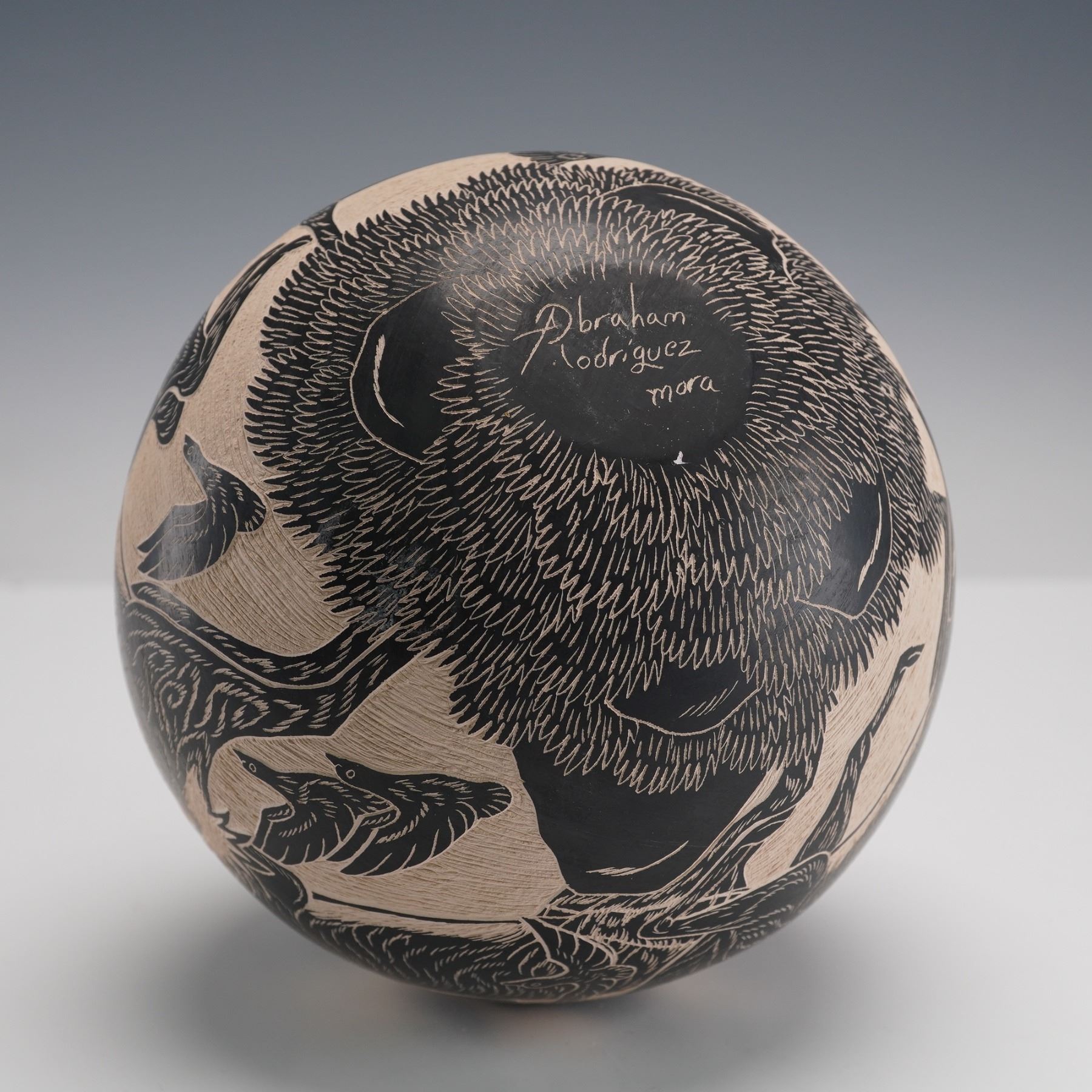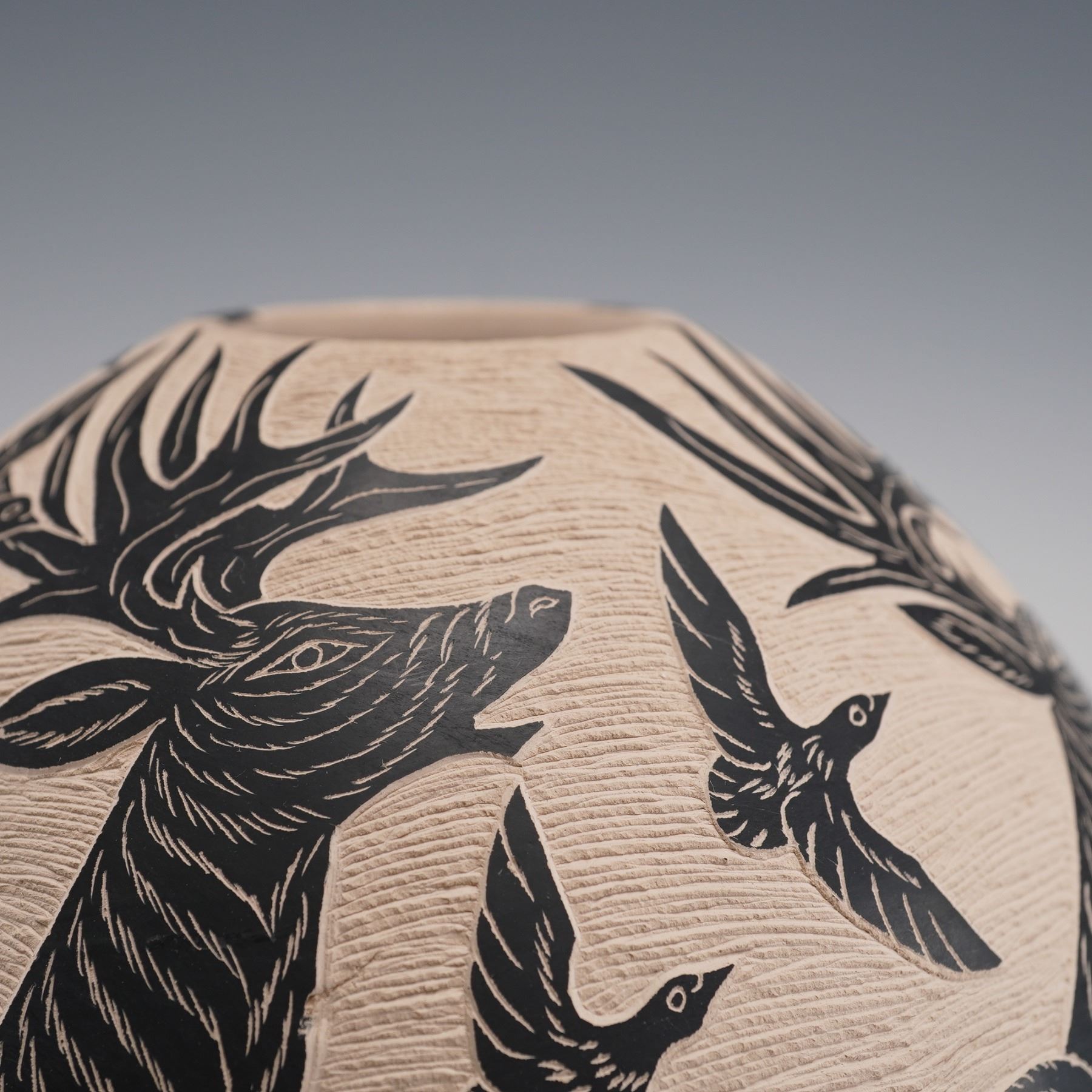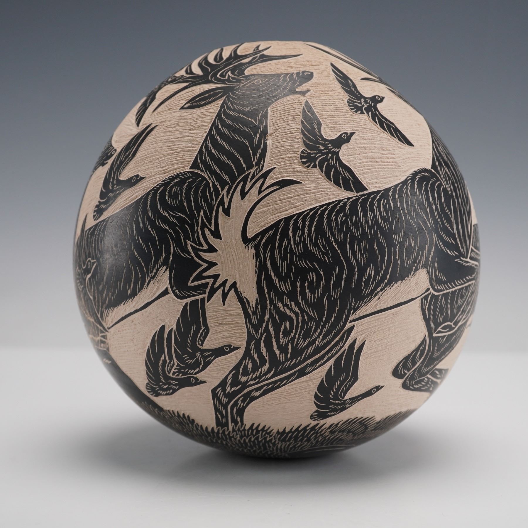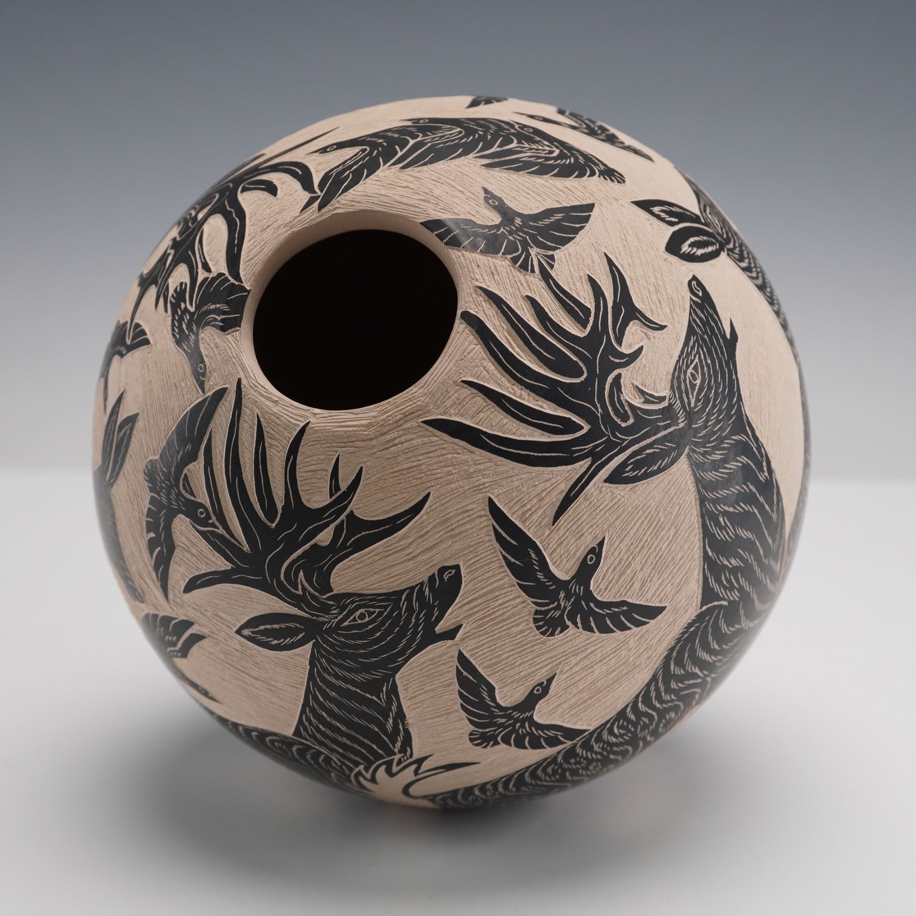 Of spherical form with a small circular mouth, this striking contemporary Mata Ortiz vase is finely burnished and slip-painted in black, then meticulously sgraffito-carved to reveal the natural clay beneath. The surface is alive with a continuous wildlife tableau: powerful stags in motion surrounded by darting birds, leaping fish, and sinuous branches, all rendered with confident linework and handsome contrast. The base is signed in the artist's hand, Abraham Rodriguez Mora, within a radiating field of etched strokes. A dynamic example of the Paquime/Mata Ortiz tradition, it displays excellent symmetry, balance, and polish, with crisp incision and strong graphic presence that reads beautifully from every angle.