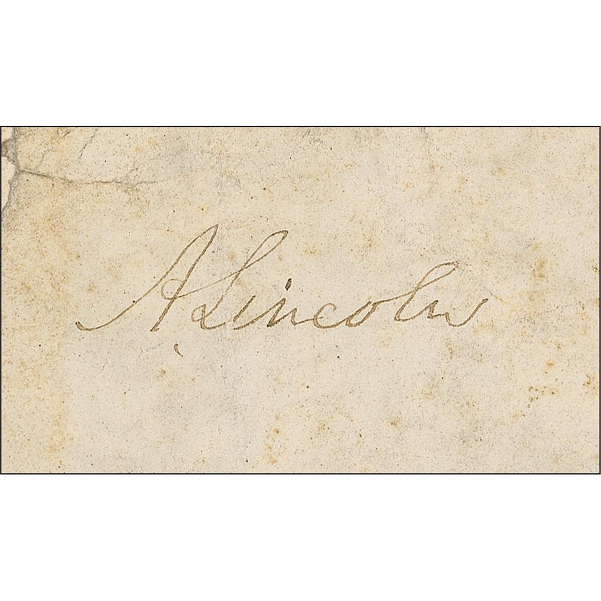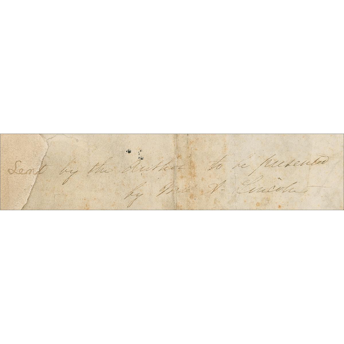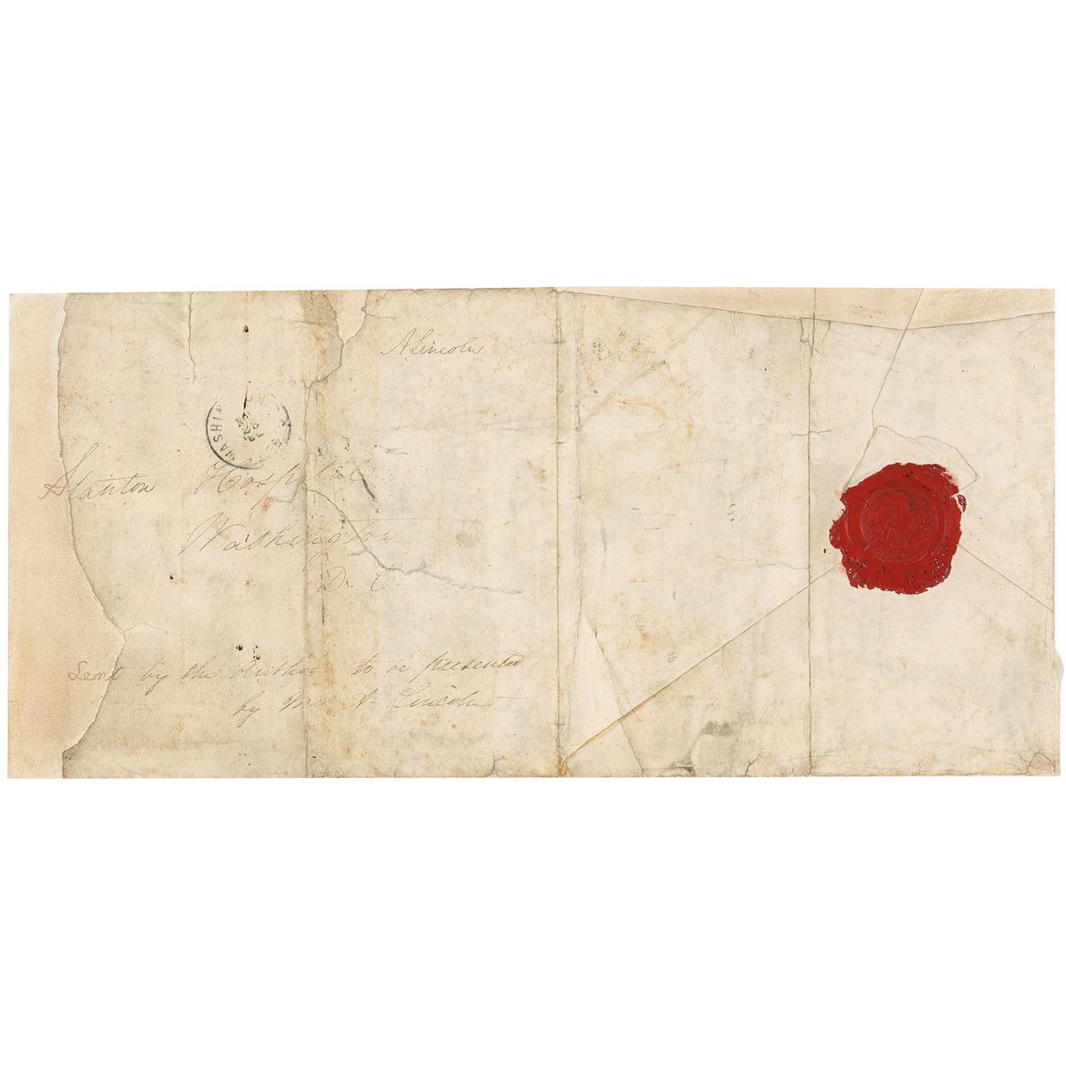 Oversized free-franked envelope portion, measuring as one 14.5 x 7 sheet, addressed in another hand, “[S]tanton Hospital, Washington, D. C.,” franked in the upper right, as president, “A. Lincoln,” and postmarked Washington, D.C., November 23, 1864. Envelope is also notated along the bottom by Mary Lincoln, “[Sen]t by the author to be presented by Mrs. A. Lincoln.” Portion of the reverse of envelope bears a complete red wax presidential seal. In good condition, with professional restoration to left edge, including a single letter of address and three letters of Mrs. Lincoln’s note, several tears, heavy creasing, with several creases lightly affecting both signatures, scattered toning and moderate soiling, and several vertical folds. All writing is quite light, but overall readable.