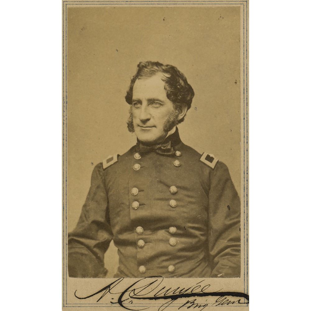 Union general (1815–1890) who commanded one of the most famous Zouave regiments, the 5th New York Volunteer Infantry; after the war he served as New York City Police Commissioner. Uncommon 2.5 x 4 carte-de-visite photo of Duryee in uniform, signed on the mount in ink, "A. Duryee, Brig. Gen." In fine condition, with a skinned back.
