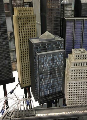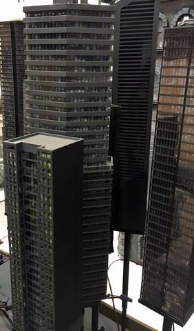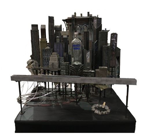 This set was created as a completely in-camera environment for the an Absolut Vodka Print Campaign. Designed by New Deal Studios co-founder, Matthew Gratzner, the set was created to be shot with no post manipulation, including shooting in front of a backing. The individual buildings each have a series of intricately wired LEDs, that just need to be re-connected to proper power supplies. To create the apparent blurred movement of the train car in the shot, it was pulled on a string during the long exposure, creating the blur. Includes vacuum formed clear styrene shot glasses that were hung by monofilament in the shot as well. Fabricated from wood, laser cut acrylic, cast resin and rapid prototyped components. Also includes framed poster of finished advertisement and raised base. 39" long x 36" tall. 1:288 ratio. This incredible, handmade miniature is from the celebrated collection of Academy Award winning New Deal Studios. New Deal Studios is a 21st Century Media Studio, unlike any in the world. A full-service film production and visual effects studio, with over 20 years of iconic imagery, New Deal Studios develops, designs, prototypes, and creates all types of high caliber media projects. Founded in 1995 by Matthew Gratzner, Ian Hunter and Shannon Blake Gans, this artist owned and operated independent studio, born in the heyday of visual effects, has truly evolved into the technology driven studio for the future, consistently delivering the perfect marriage of artistry and technology. Award winning credits by New Deal Studios include high-profile projects such as Dark Knight Rises, Hugo, The Avengers, Oz the Great and Powerful, Iron Man, The Dark Knight, Watchmen, I am Legend, Night at the Museum, Whiteout, 2012, Alice in Wonderland, Inception, Battleship and Interstellar.