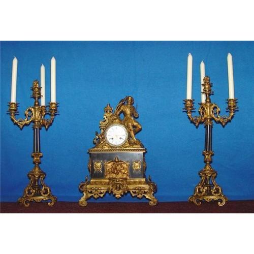 We are so excited to present to you this beautiful bronze clock set with the two candlesticks!!Nothing is missing or broken, it?s all in this original condition, just like it was manufactured about 1850, and nothing is refinished! Our restoreman has only cleaned the two candlesticks, and the complete clock! This bronze work could only make a real artist and master of the bronze casting handicraft.The dial plate is signed by "Duseigneur et Fils". The clockwork is running on time and everything is in perfect condition.This is the kind of piece that top designers hunt long and hard for!On the top of the clock is a fine carved bronze knight with his sword. I bought this clock set out of a castle near Marseille in the South of France. If you have an eye for an unique piece that will give your home that one of a kind look,this is it !The dimensions are:Clock,Height 19",Width 14" and Depth 6 Inches.Candlesticks without candles,Height 22,5",Width 10"and Depth 10 Inches.