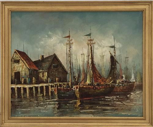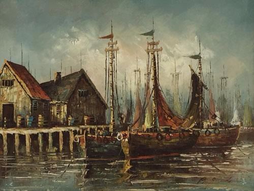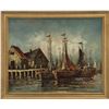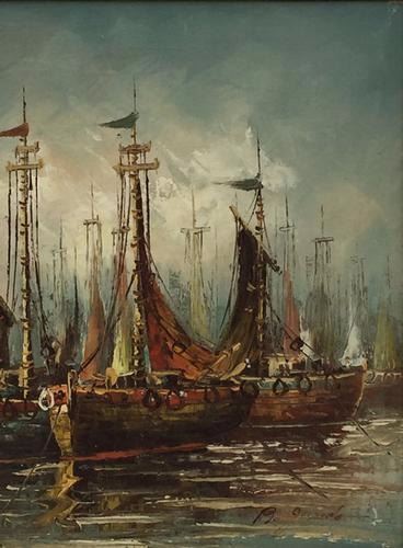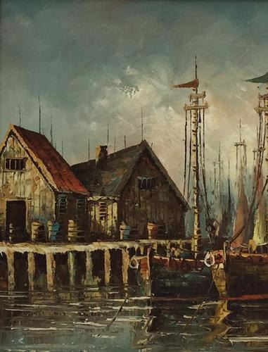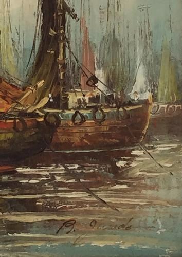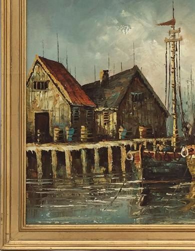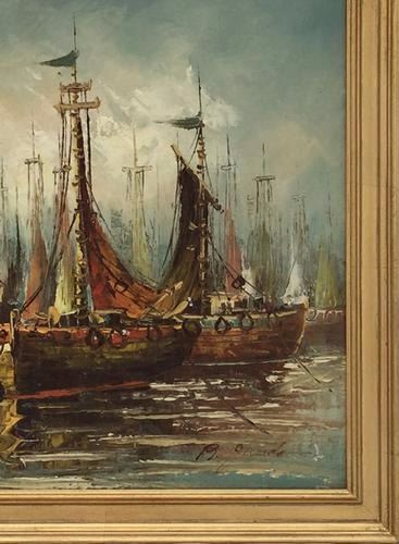 Absolutely Breathtaking Signed Port Scene in Oil. Original oil on canvas, signed and beautifully framed. Exquisite vintage composition depicting sailboats at dock. Signed B. or R. Jurado at bottom right. This is a truly lovely piece in a color palette which is both sot and warm and will complement many decors. Oil on canvas. Simply but attractively framed . Ready to display. Size: 22X19 inches. Country of origin: France.