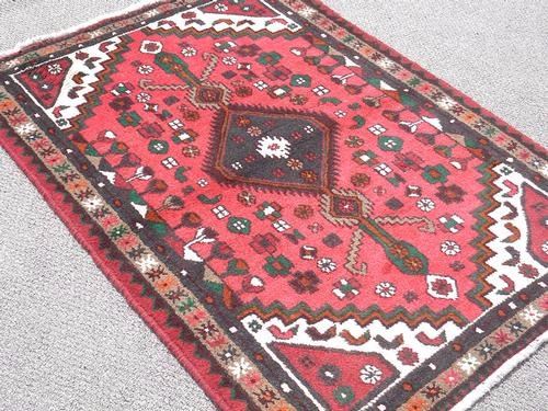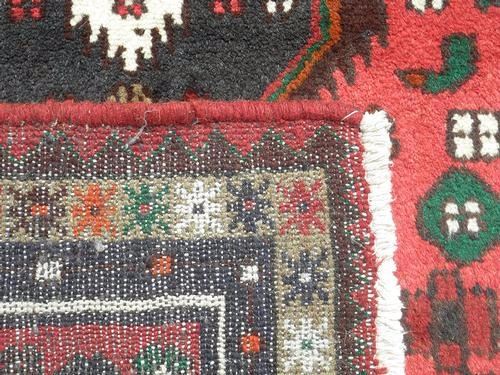 Absolutely Fascinating Hand Made Persian Hamadan. Made of fine quality baby lamb's wool pile on cotton foundation. All natural vegetable dye, incorporating a geormetric pattern on a red background, large dual headed central medallion and an intricately detailed floral multi layered border. Great contrast in the variety of colors. Hand woven in City of Hamadan from Iran. About Hamadan Rugs: Hamadan is the capital of an eponymous province, and it's one of the oldest cities in Persia. It's also one of Persia's most productive and diverse weaving centers. Over the years, many refugees, minorities and ethnic groups have inhabited the area. Like other cities in the western part of Persia, Hamadan produced fine, coarse carpets that are made with the symmetric Ghiordes or Turkish knot. Due to the sheer number of villages in the province of Hamadan and the area's ethnic diversity, many unique designs are featured in these regional Rugs. Traditionally, Hamadan has been a center for commercial carpet production. The fragmented ethnic groups that have historically lived in Hamadan include Kurds, Azeri Turks and Islamic people. Antique Hamadan Rugs traditionally favor angular designs although large-scale arabesques and curvilinear motifs are also found. They are closely related to Rugs produced in the neighboring areas of Bibakabad, Shiraz, Lilian and Dozens of cities that produce local styles. Size: 4 feet 9 inches X 3 feet 4 inches. Country of Origin: Iran.