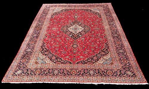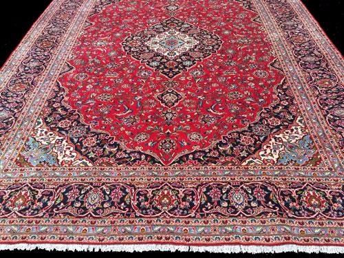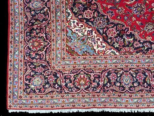 Absolutely Gorgeous & Spectacular Persian Qamsar-Kashan Rug. Made of all natural, vegetable, dye, hand woven, baby lamb's wool pile on cotton foundation. It is certainly rare and uncommon to come across Kashan Qamsar in the marketplace. Very few pieces are ever woven in this satellite town in the proximity of the city of Kashan. so it is no wonder that the few that are produced are of extreme high quality and artistic workmanship. Please notice the intricate design and well balanced color palette, combined with a superior baby lambs wool quality and highly dense weave, producing a well defined and crisp pattern. Where a typical Persian rug employs between twelve and sixteen colors, this lovely piece features over thirty eight different colors. this rug is masterfully hand woven, knot by knot, using superior quality baby lamb's wool with about 100 knots per square inch. it takes a master weaver over three years to create this beauty and bring it to the marketplace. The leather band sewn on the edge at the back of this rug is to keep the edges from curling under due to the extreme tightness of the weave. Please notice that also attesting to the fine weave is the fact that the back of this rug looks as good as the front. Size: 12 feet 6 inches X 9 feet 6 inches. Country of origin: Iran.