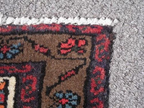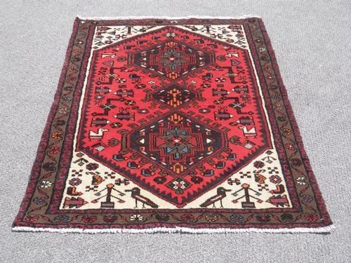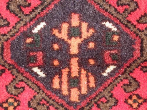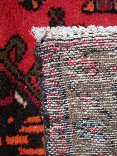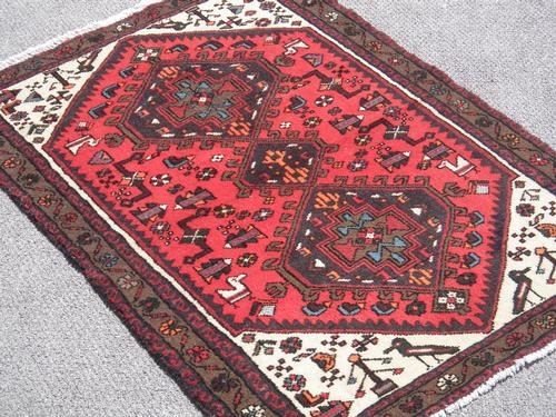Absolutely mesmerizing fine Persian Hamadan. Size: 4 feet 9 inches X 3 feet 3 inches. Made of fine quality baby lamb's wool pile on cotton foundation, all natural vegetable dye. Hand woven in Hamadan, Iran. The gorgeous geometrical design on the rich red background is the unique feature of this Rug. The artist has used symmetrical geometric design incorporating orange, aqua and white color on the both ends. This piece has a unique elegant design and well worth the investment.