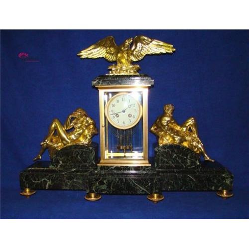 Absolutely Incredible Mantel Clock !! SIMPLY STUNNING!! Take a moment and get a look at one of the most fabulous mantel clocks we have had the pleasure to offer for auction in some time! We were lucky to acquire it from a lovely Private estate in the South of France near Cannes!The clock dates from the third quarter of the 19th C. (c.1880).The style of this marvelous mantel clock is Renaissance and the bronze gilt figures with the gorgeous eagle on top are in a perfect condition.The two mythological figures on the sides represent Samson and Dalila.The dark green marble with the grey veins is in fantastic condition and looks great!Perfect running and striking condition with 8 days going work and the 1/1 and 1/2 hours striking on a gong.The chime on that gong is fantastic!The clockwork is driving by a pendulum filled with mercury what is very unusual!The bronze movement is stamped with" H.S.T.-France",probably made by Henri-Simon Tharlien,the most famous clockmaker in France at that time.The four glass plates around the clockwork are beveled and there is a door behind and at front!The dimensions are: Height: 20 Inches, Width: 27 Inches and Depth: 7 Inches.Because the clock is that big and heavy(70 LBS) the shipping costs will be 350 US$.This figural mantel clock is everywhere an absolutely eye catcher that you will never get again.Regarding shipping we will pack the clock in a wooden box so you will receive it in perfect condition.After payment you will receive the clock in about ...