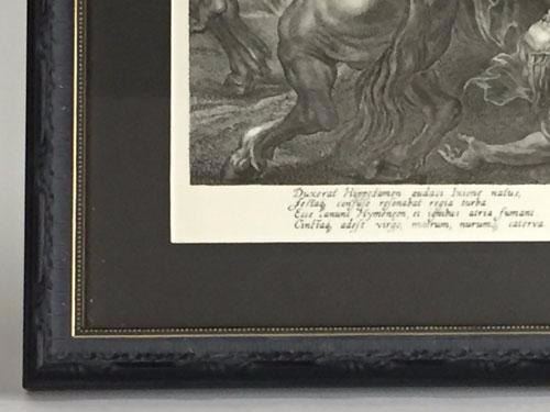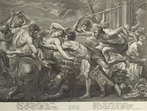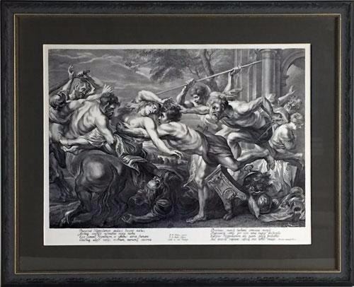 Absolutely Rare and Magnificent Peter Paul Rubens Lithograph. Beautifully matted and framed Rubens lithograph. A beautiful, dramatic, classical lithograph of a work by 17th century Flemish baroque painter Peter Paul Rubens, the rape of Hippodamia; combat of the Lapithea. Lithograph created by Pieter De Balliu, born 1613 - died 1660 (print maker). This lithograph is high quality, high contrast, based on Greek mythology, inscribed in Latin, and exquisitely matted and framed - truly exceptional! Size: 24X19 inches. Country of origin: France.