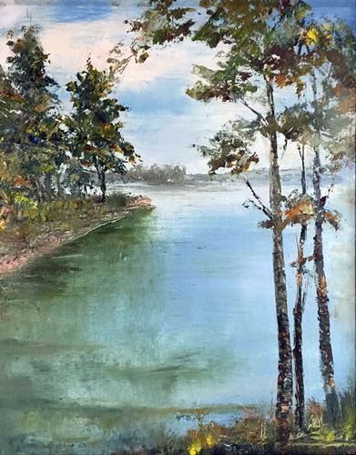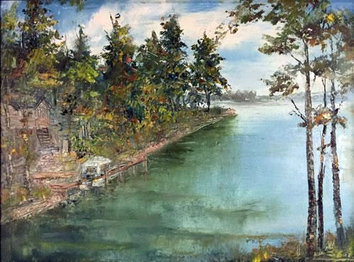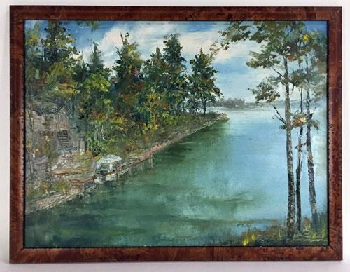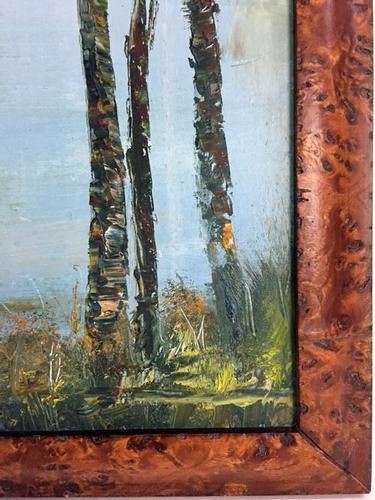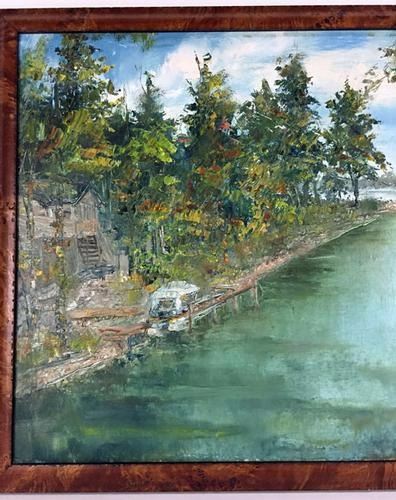 Absolutely Remarkable Impressionistic Waterscape Painting. Original oil on board framed. Wonderful impressionistic rendering of elevated waterfront dwelling and boat on river opening onto the endless horizon of a larger body of water. Very interesting positive and negative technique combines smooth brush strokes in some areas, Thick layering of paint in others, and removal of paint in yet other spots. This work combines dozens of shades of blue and green, colorful foliage, and a magnificent distressed frame that reiterates the brown tones and reinforces the painting rustic natural theme. There may be a ghost of a signature at the bottom right, but this is uncertain. Size: 26X20 inches. Country of origin: France.