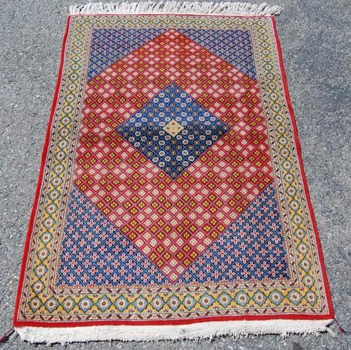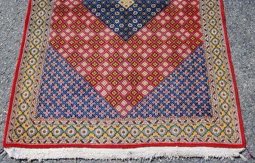Absolutely stunning handmade Persian Mahal Rug. Size 4.9 X 3.5 feet, made of 100% baby lamb's wool pile on cotton foundation, all natural vegetable dye, all over design on a red background; contrasted with dark Crowned corners, and beautifully detailed intricate beige floral trim. A stunning rug with great look thanks to the contrast in colors. From Mahal, Iran.