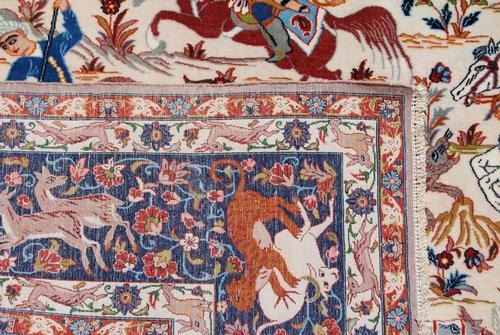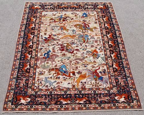Absolutely breathtaking high quality Semi-Antique Persian Isfahan Rug. 100%natural, vegetable dye, hand woven, finest baby lamb's wool pile on silk foundation. this is a beautiful Isfahan with glowing baby lamb's wool of superior quality which gives a lustrous appearance of utmost beauty. this is an exceptionally intricate and exquisite piece in design. color scheme and weave. This fabulous piece has the most dazzling array of color palettes. Where a typical Rug is limited to a range of about twelve and sixteen colors. This lovely piece features more than twenty eight different colors. Size 5 feet X 7 feet 4 inches.