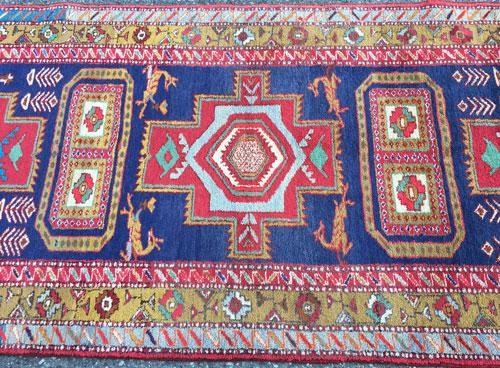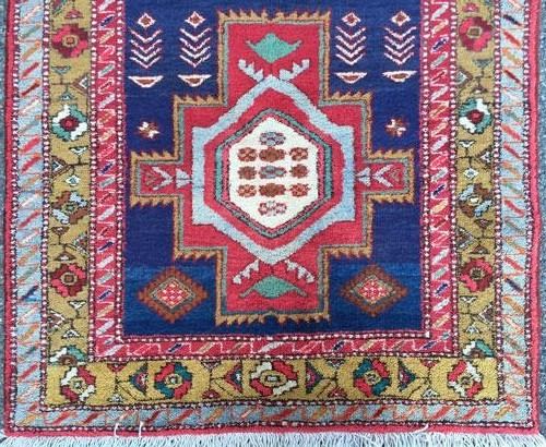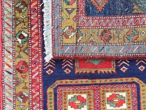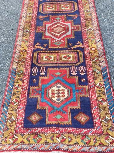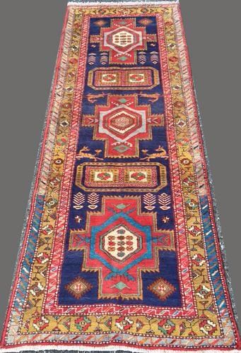 Absolutely fabulous & colorful vintage Persian Qarajeh Rug. 100% natural, vegetable dye, hand woven, superior quality hand spun wool pile on cotton foundation. This is a vintage, mid-20th century Qarajeh in mint condition. this enchanting piece, like every other village made rug is woven by the women of the household, incorporating symbols and motifs that reflect weaver's everyday life experiences and cultural beliefs such as, prosperity, fertility, good luck and good fortune as well as elements that ward off the evil eyes. Qarajeh rugs are known and valued for their artistic & colorful character. These rugs have their own very unique style & therefore are very distinguishable from other styles. This lovely piece has the most beautiful and artistic color combination with amazing details. Village of Qarajeh is located in the northwestern part of Iran in the proximity of the town of Heriz and has a very limited rug production, making it one of the more sought after village made pieces among the Persian rugs. It is also amazing that a village made piece would have such a contemporary appearance and appeal. Please notice the enchanting animals (vigilante dogs) adorning this piece. Size: 10 feet X 3 feet 9 inches. Country of Origin: Iran.
