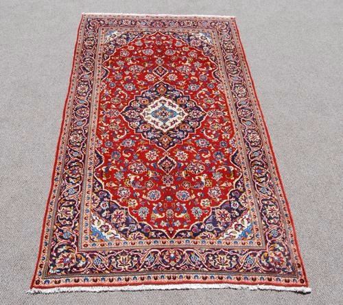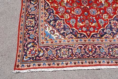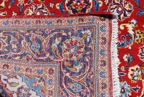Absolutely gorgeous and spectacular large Persian Kashan, 4.10 X 9.5. Made of all natural, vegetable, dyed, hand woven, baby lamb and wool pile on cotton foundation. Please notice the intricate design and well balanced color palette, combined with a superior baby lambs wool quality and highly dense weave, producing a well defined and crisp pattern. Where a typical Persian Rug employs between twelve and sixteen colors, this lovely piece features over third eight different colors. This Rug is masterfully hand woven, knot by knot, using superior quality baby lamb and wool with about 100 knots per square inch. it takes a master weaver over three years to create this beauty and bring it to the market. please notice that also attesting to the fine weave is the fact that the back of this Rug looks as good as the front. The leather band sewn on the edge at the back of this rug is to keep the edges from curling under due to the extreme tightness of the weave. creases in this rug are due to fold and not a defect. Size: 4 feet 10 inches X 9 feet 5 inches. Country of origin: Iran.