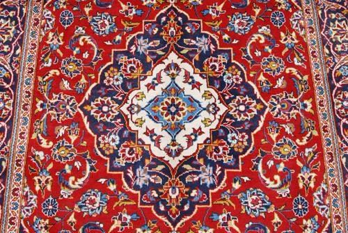 Absolutely gorgeous and spectacular large Persian Kashan, 4.10 X 9.5. Made of all natural, vegetable, dyed, hand woven, baby lamb and wool pile on cotton foundation. Please notice the intricate design and well balanced color palette, combined with a superior baby lambs wool quality and highly dense weave, producing a well defined and crisp pattern. Where a typical Persian Rug employs between twelve and sixteen colors, this lovely piece features over third eight different colors. This Rug is masterfully hand woven, knot by knot, using superior quality baby lamb and wool with about 100 knots per square inch. it takes a master weaver over three years to create this beauty and bring it to the market. please notice that also attesting to the fine weave is the fact that the back of this Rug looks as good as the front. The leather band sewn on the edge at the back of this rug is to keep the edges from curling under due to the extreme tightness of the weave. creases in this rug are due to fold and not a defect. Size: 4 feet 10 inches X 9 feet 5 inches. Country of origin: Iran.