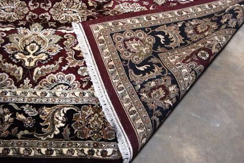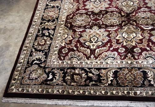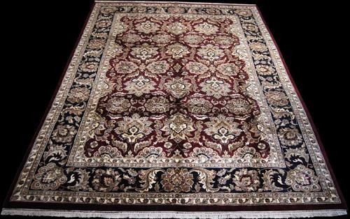 Absolutely stunning handmade allover floral design mahal. Made of 100% baby lamb and wool pile on cotton foundation, all natural vegetable dye, a gorgeous floral motif design perfectly placed allover on a rich burgundy background; contrasted with a beautifully detailed intricate black floral trim. A stunning Rug with great look thanks to the contrast in colors. Size: 10 feet X 14 feet. Country of origin: Turkey.