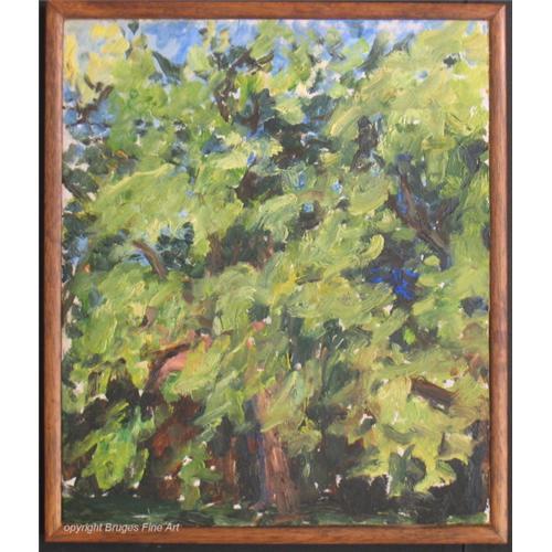 A 'trees and leafage' impression, painted on card laid on fiberboard and set in its original natural wood frame; should date from the 60's. Overall size is 14 x 16?. This modern oil landscape, bordering the abstract, comes from a Sotheby's sale dispersing lots from the collection of the British Culme-Seymour estate, the Baronets of Devon. The author is unknown but as the work shows great maturity in style and technique, there is no doubt a significant artist behind.