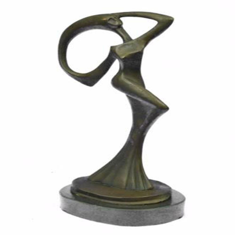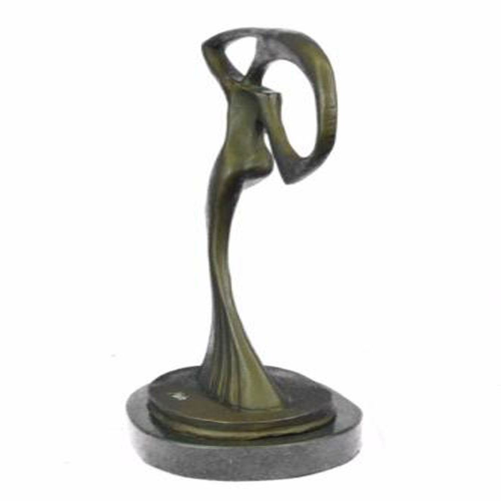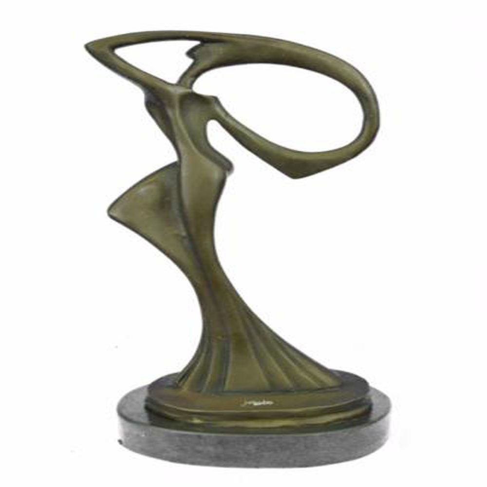 The suggestive female form pulls out of the base from the hem of a fanned skirt that evolves into the definition of her bent leg. Her arms both rest on her head, one in the shape of an angle while the other a circular motion in combination with her long hair. The sculptures creates an essence of spiritual freedom that distorts the distinction of the body form. The bronze sculpture was captured using the ancient method of lost-wax casting and stained with a brown patina finish for preservation and it is mounted upon a marble base. Bronze Dimensions with Marble Base: Height 14 X Width 7 inches. Weight: 9 LBS.