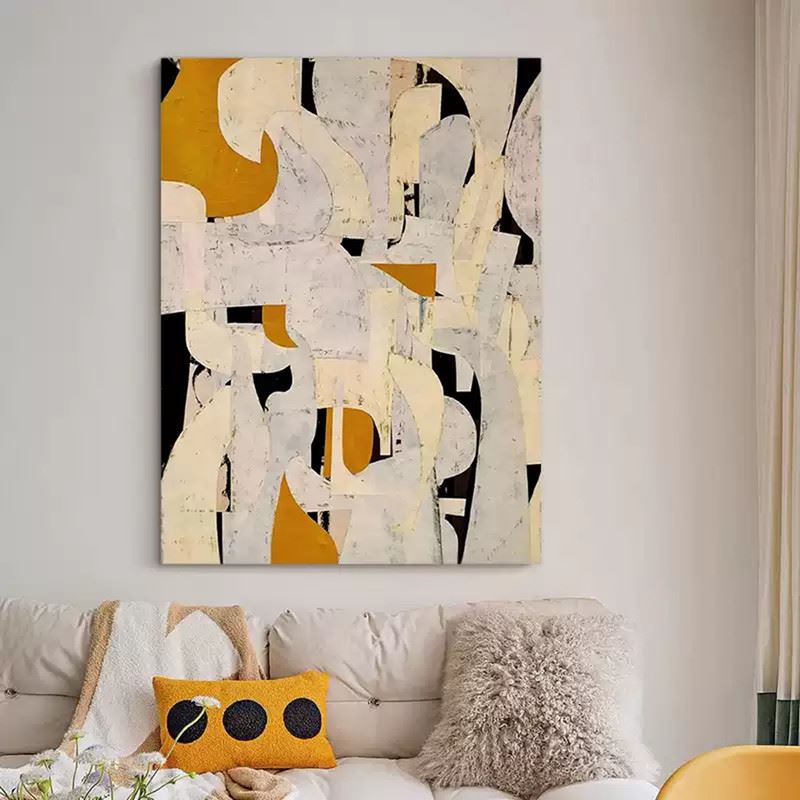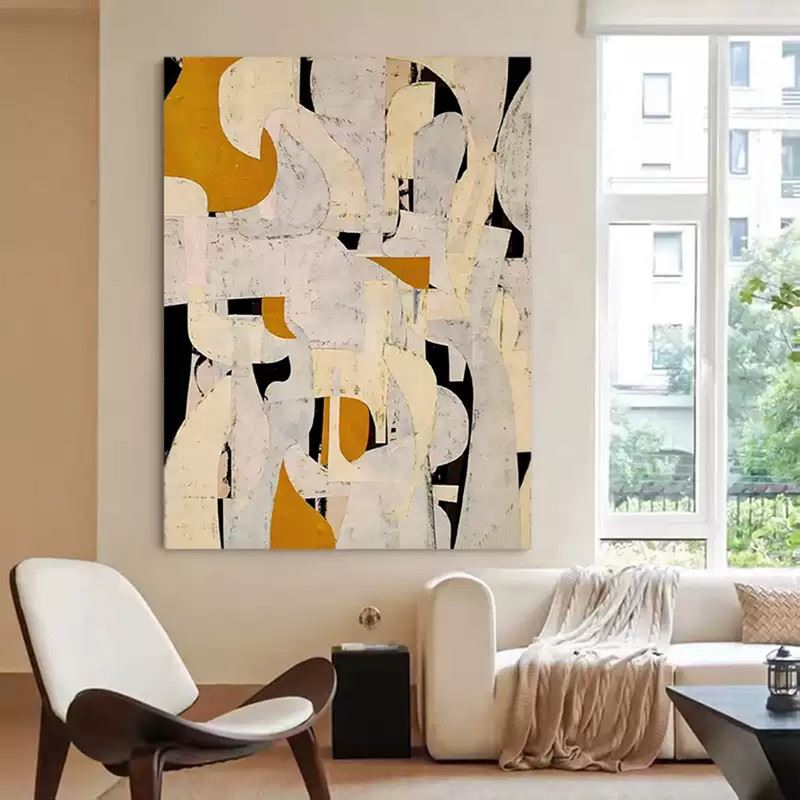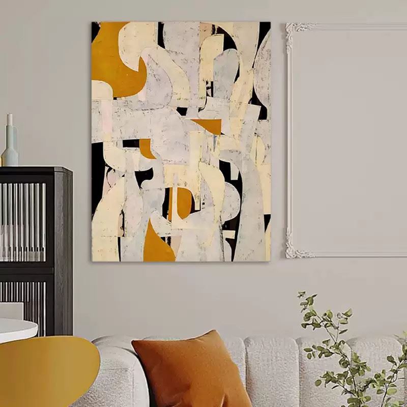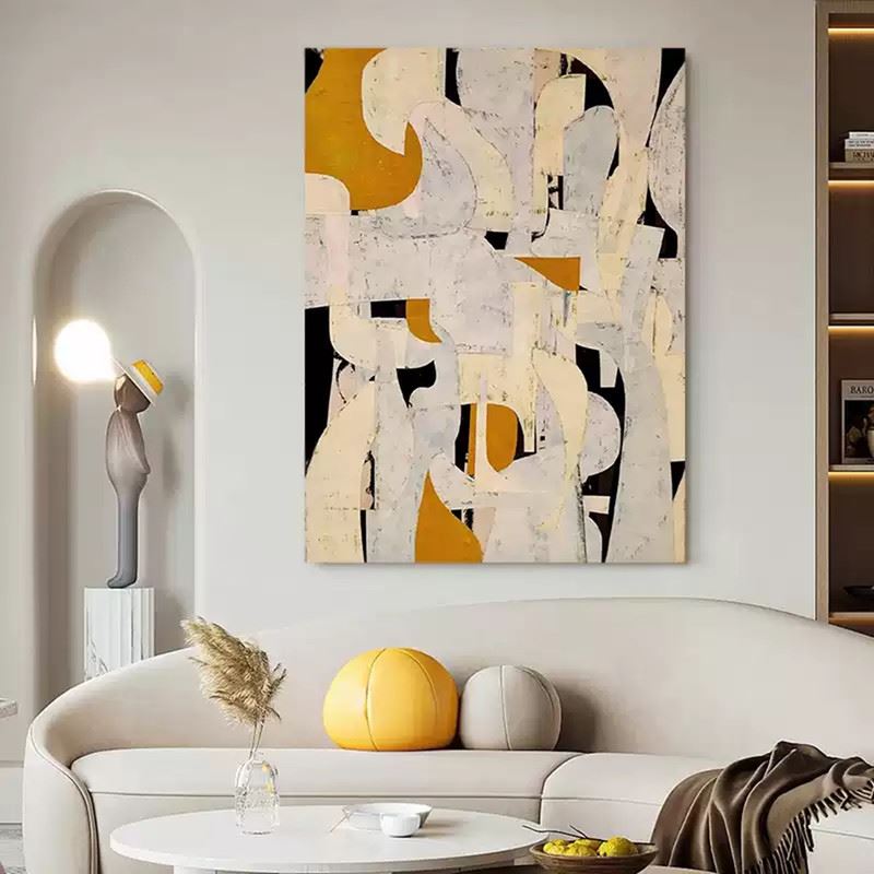 This artwork uses simple geometric shapes and soft tones to present a modern abstract beauty. The interplay of white, yellow, and black creates a dynamic contrast, showcasing the randomness and flow of shapes, as if offering a visual enigma and allure. Dimensions: 24 x 31 inches.