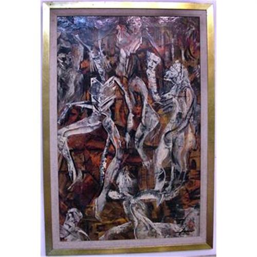 Signed Abstract painting Titled on rear AQUELARRE TRADICIONAL or Traditional Witches-Sabbath, circa 1940's. Exhibited at the Gilbert Art Gallery, San Francisco (partial Label on verso).ff Oil on artists board. 22" X 14". Plus $35. shipping domestic Lower 48 states, slight additional for Alaska and Hawaii.