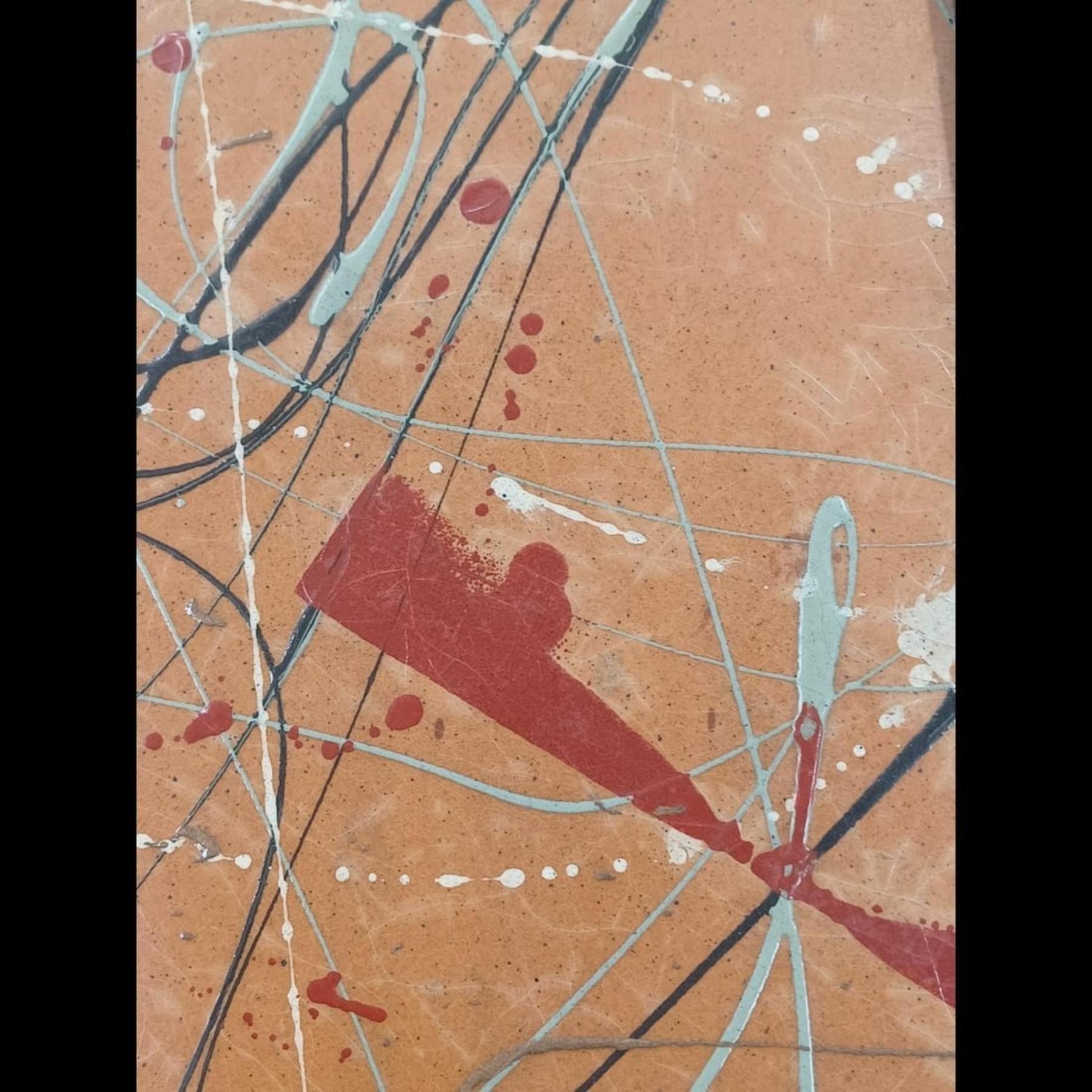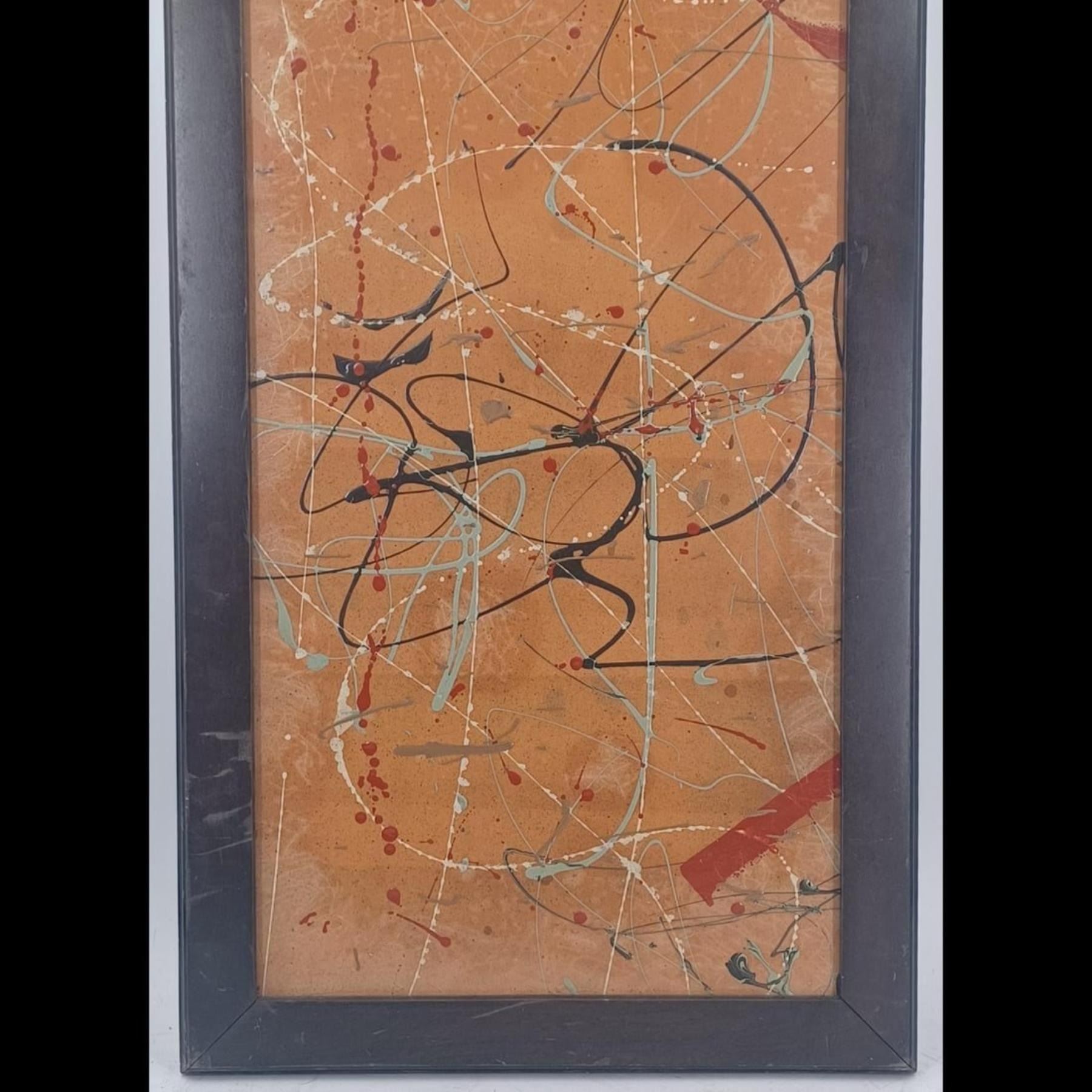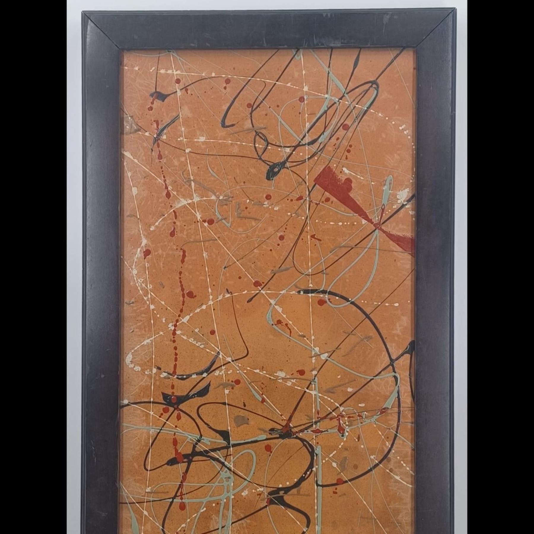 Abstract Expressionist Wood Panel Painting In The Style Of Jackson Pollock. Measures approximately 18-1/2" x 37-1/4" - tall and heavy piece.