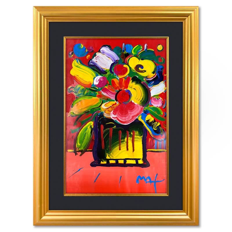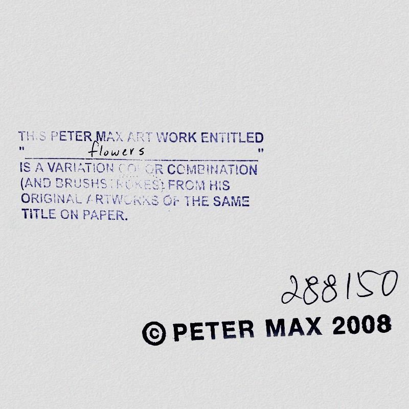 "Abstract Flower" is a one-of-a-kind mixed media on paper, hand signed by Peter Max. The piece comes custom framed with a backside cutout to display Peter Max Studio registration number 288150 certifying authenticity. Measures approximately 48" x 36" (frame), 36" x 24" (image).