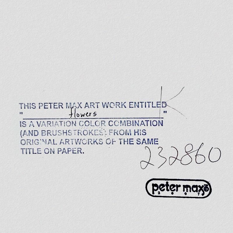 "Abstract Flower" is a one-of-a-kind mixed media on paper, hand signed by Peter Max. The piece comes custom framed with a backside cutout to display Peter Max Studio registration number 232860 certifying authenticity. Measures approximately 48" x 36" (frame), 36" x 24" (image). This item requires special handling and may have a longer than usual turnaround.