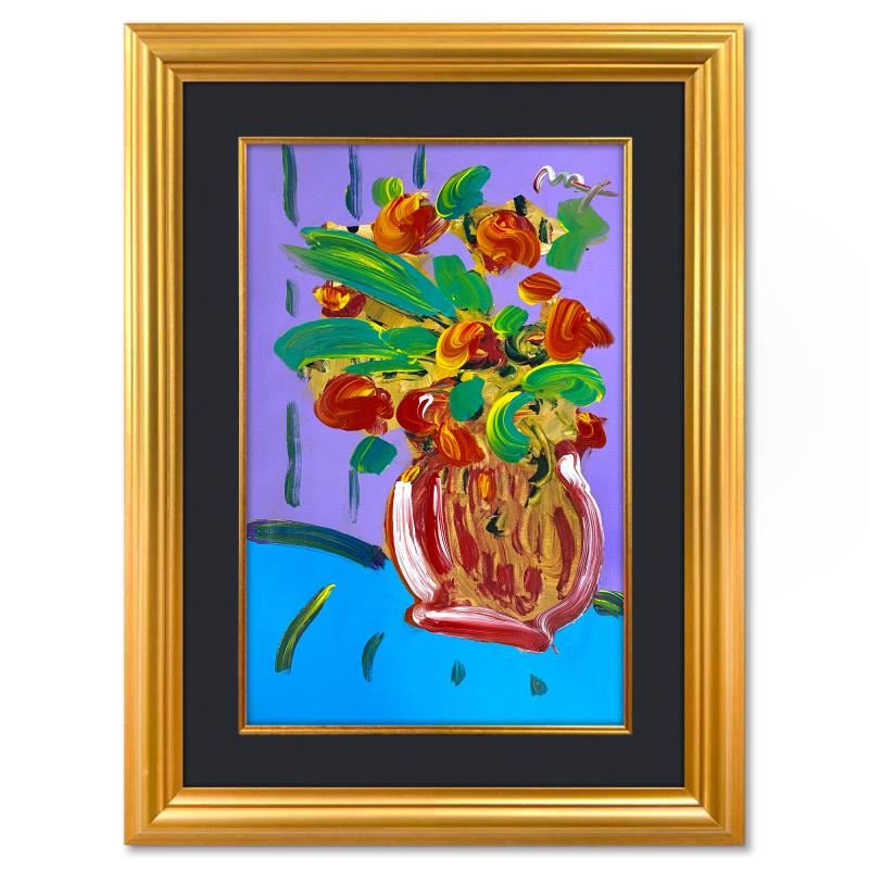 "Abstract Flower" is a one-of-a-kind mixed media on paper, hand signed by Peter Max. The piece comes custom framed with a backside cutout to display Peter Max Studio registration number 230073 certifying authenticity. Measures approximately 48" x 36" (frame), 36" x 24" (image). This item requires special handling and may have a longer than usual turnaround.