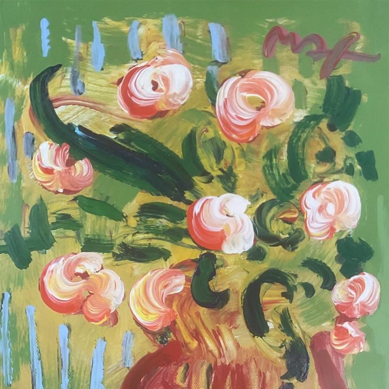 "Abstract Flowers (Green)" is a one-of-a-kind acrylic mixed media on paper, hand signed by Peter Max. The piece comes custom framed with a backside cutout to display Peter Max Studio registration number 255801 certifying authenticity. Measures approx. 48.5" x 36.5" (frame), 36" x 24" (image).