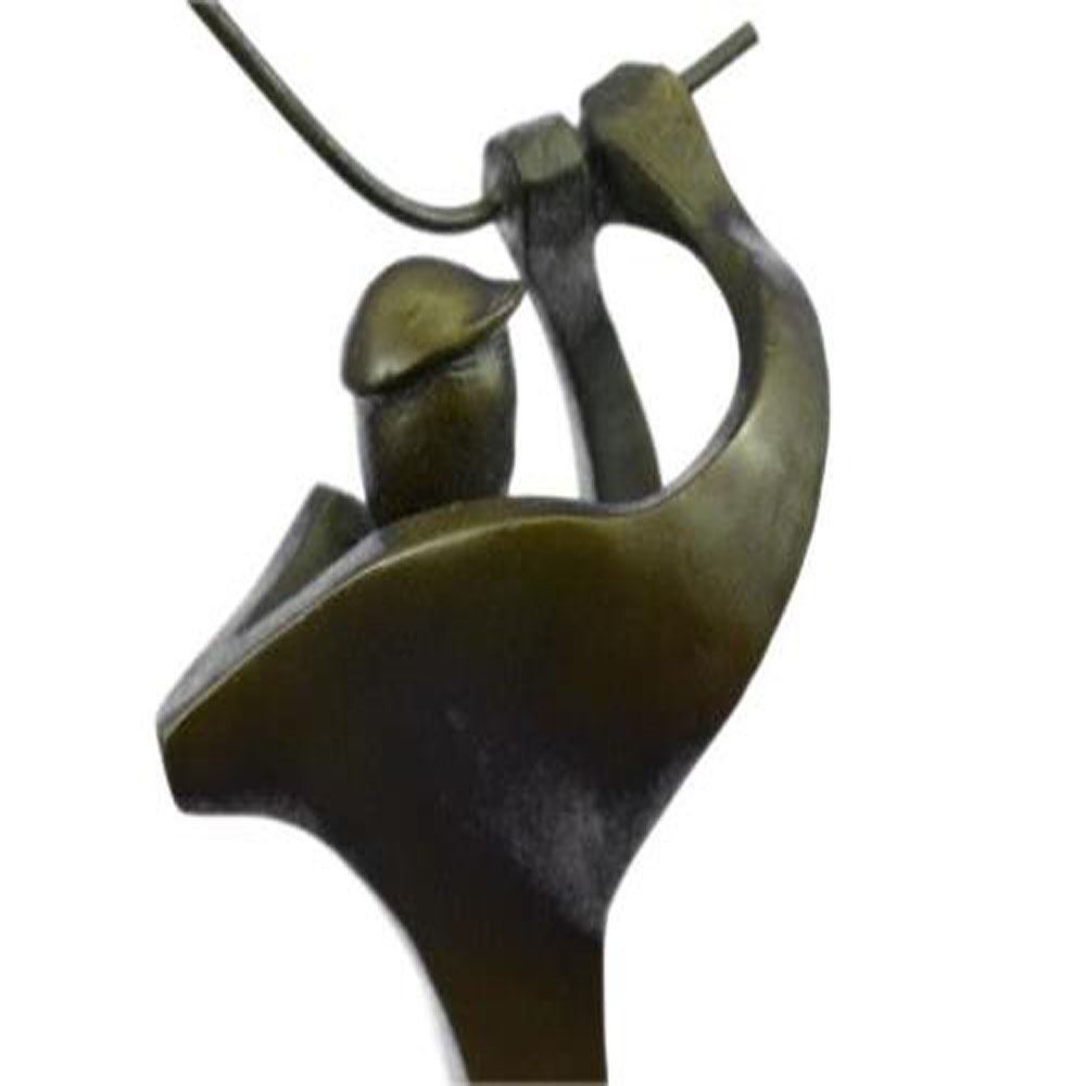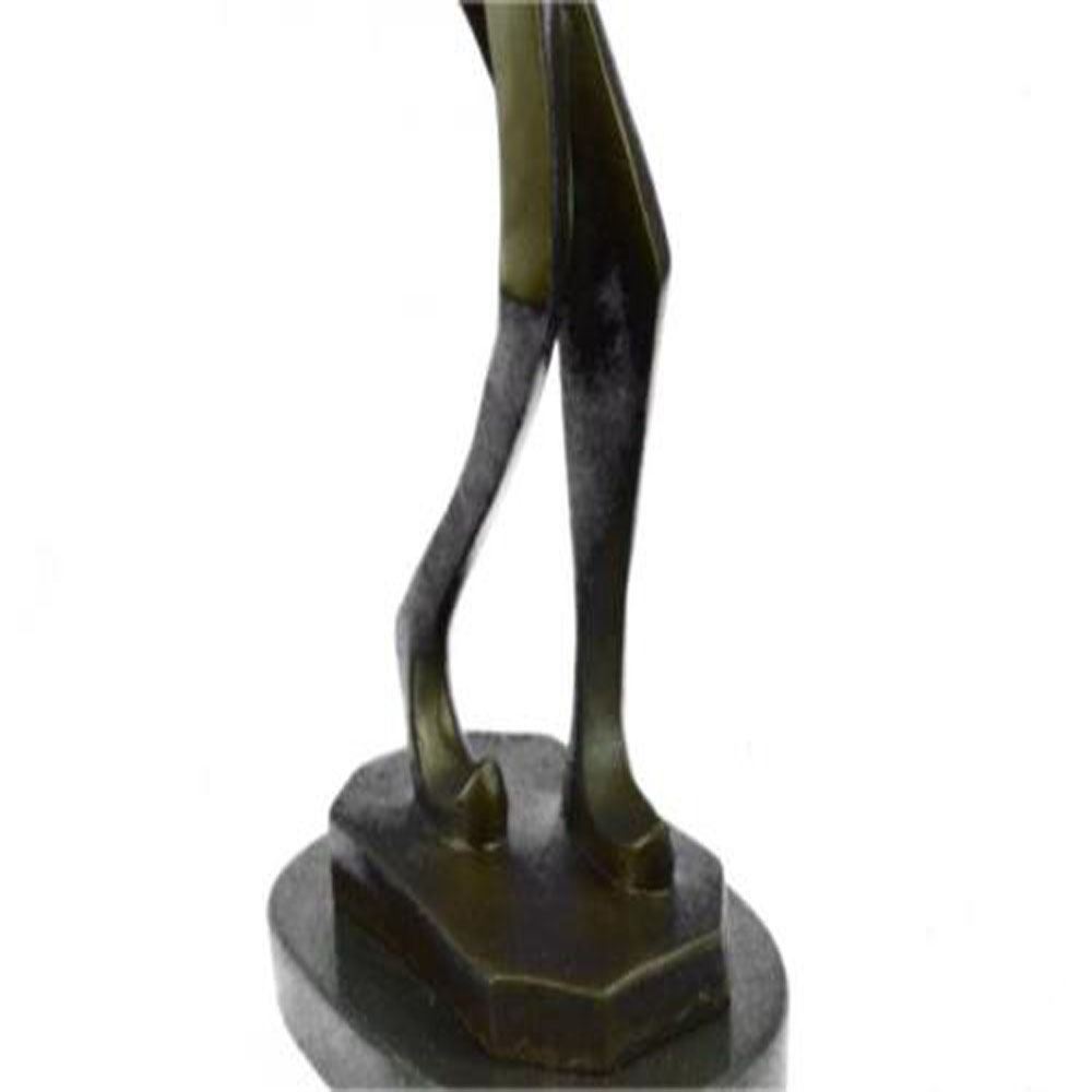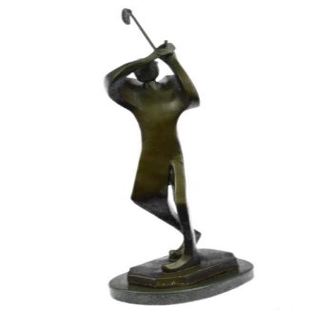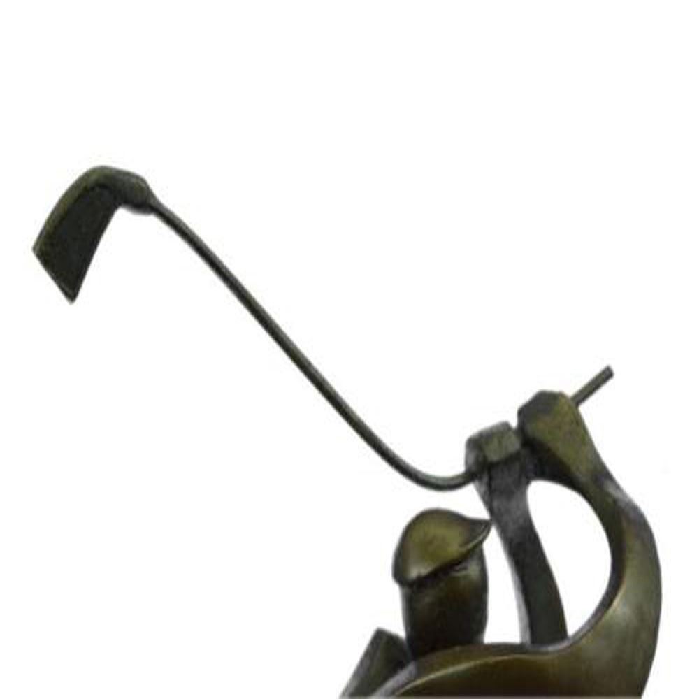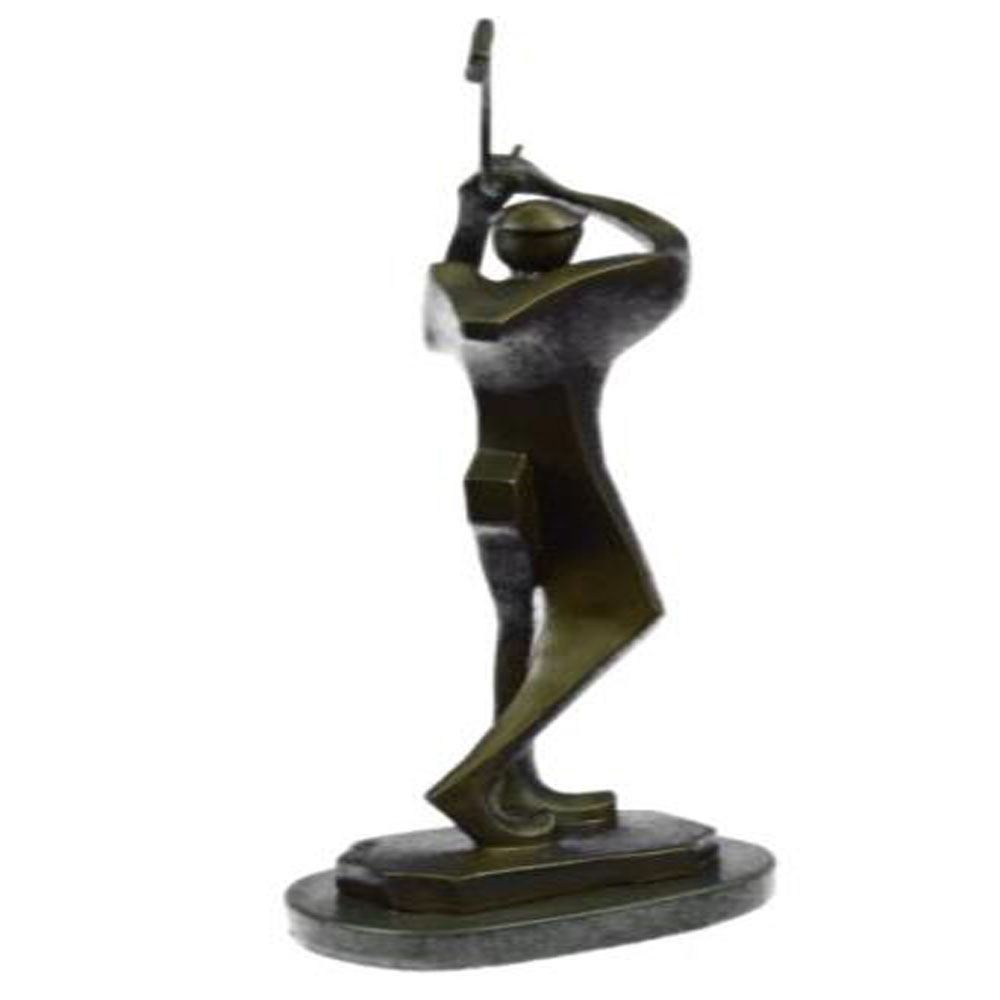 This abstract golf sculpture is an unique interpretation of the sport. The bulky athlete has his club swung back in the air. The motion just after a powerful hit was made. This piece is a eclectic and classy version a typical golfer piece. It would be a great piece for a golf or abstract art enthusiast. The sculpture was crafted using the lost wax method and stands on a marble base. Bronze Dimensions with Marble Base: Height 13 X Width 7 Inches. Weight: 8 LBS.