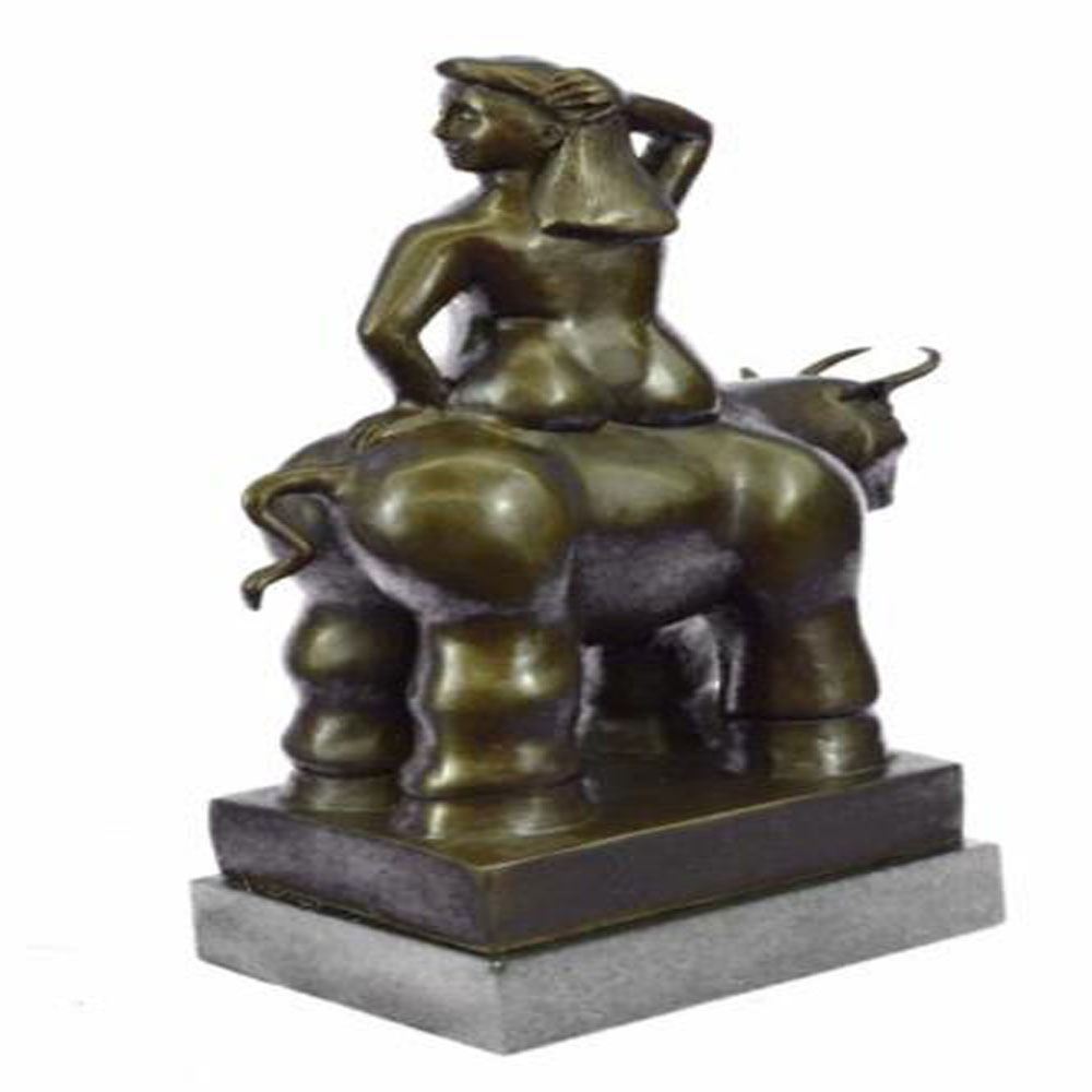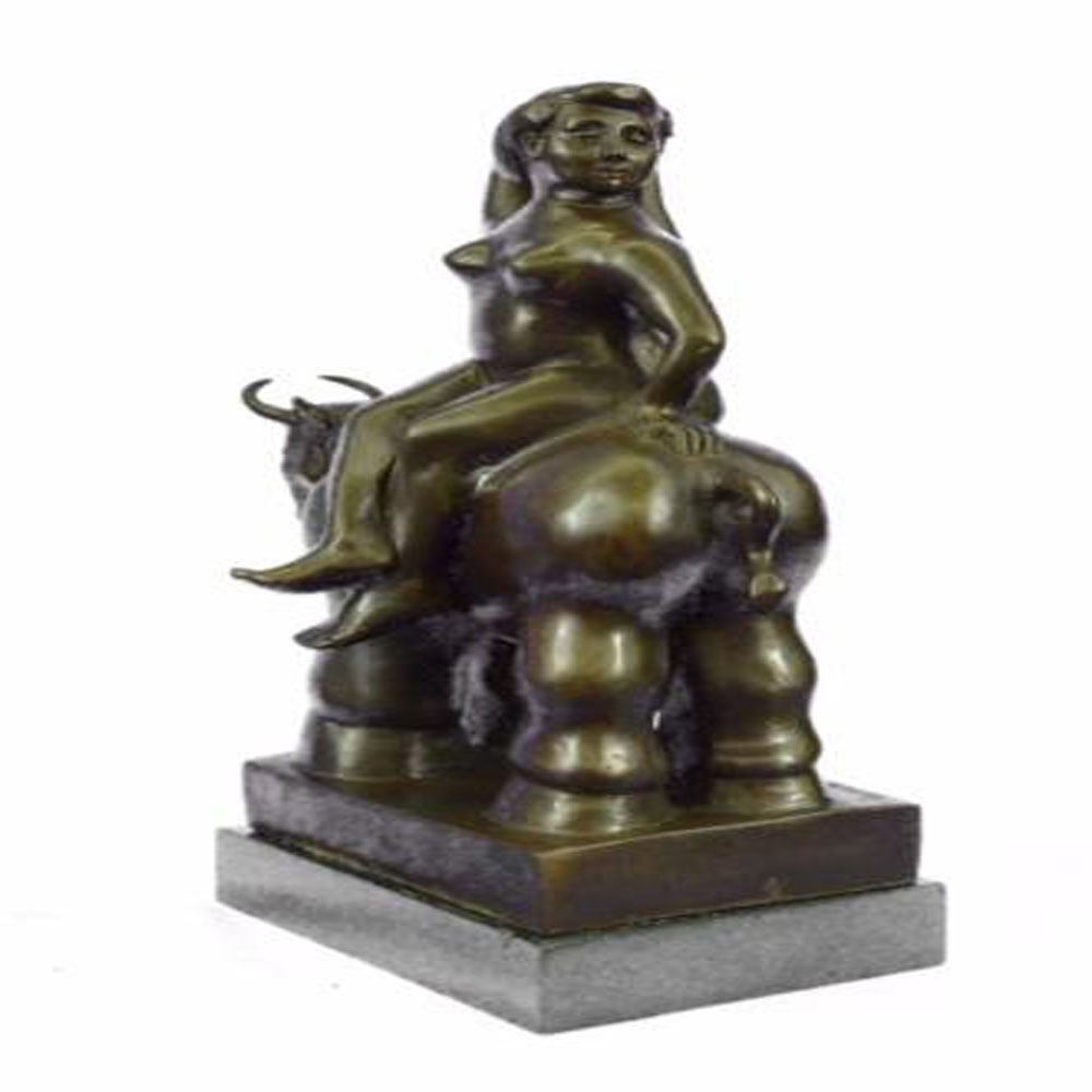 This proportionally exaggerated bronze sculpture is abstract and representational style. The bold woman rides on the back of a large bull, plump and confident, with her right arm behind her turned head. The artists dramatic emphasis on shape and volume creates a great attraction and tangibility to form. The sculpture was molded by using the lost wax casting method and finished with brown patina tarnish allowing intricate work to come through the precious metal. Bronze Dimensions with Marble Base: Height 13 X Width 9 Inches. Weight: 12 LBS.