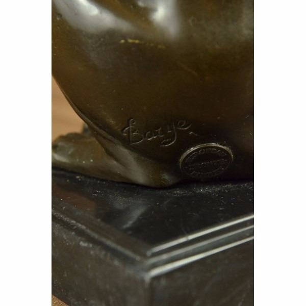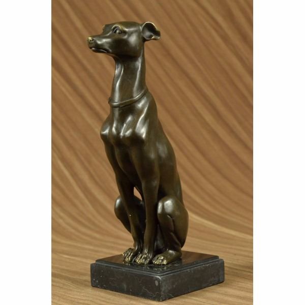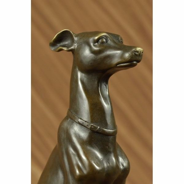 This sculpture of this beautiful and strong Grey Hound is amazing. This lovely dog sculpture would go perfect in anyone house, as a keeper or a gift you must see it face to face. The details on each part of his body is astonishing from is face, tail, bones, legs everything is spectacular. This sculpture was cast using for ancient old "Lost Wax Method" stained in brown patina. 100% handmade and 100% bronze, which is mounted up top a black marble base and its signed Barye. Condition: This sculpture is in a perfect condition. Bronze Dimensions with Marble Base:Height 11" x Width 5" Marble Dimensions: 4" X 4" Height without base: 10" Weight : 9 LBS Inventory : 64AL3504346