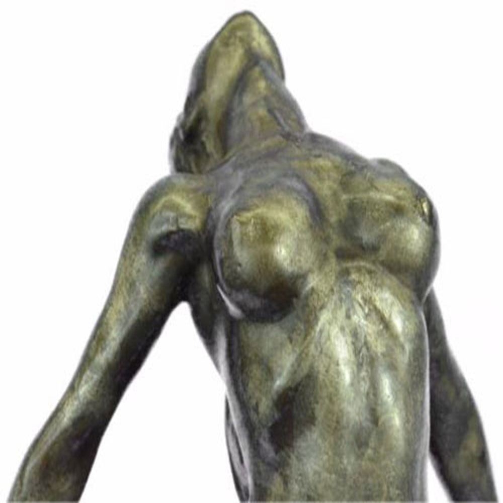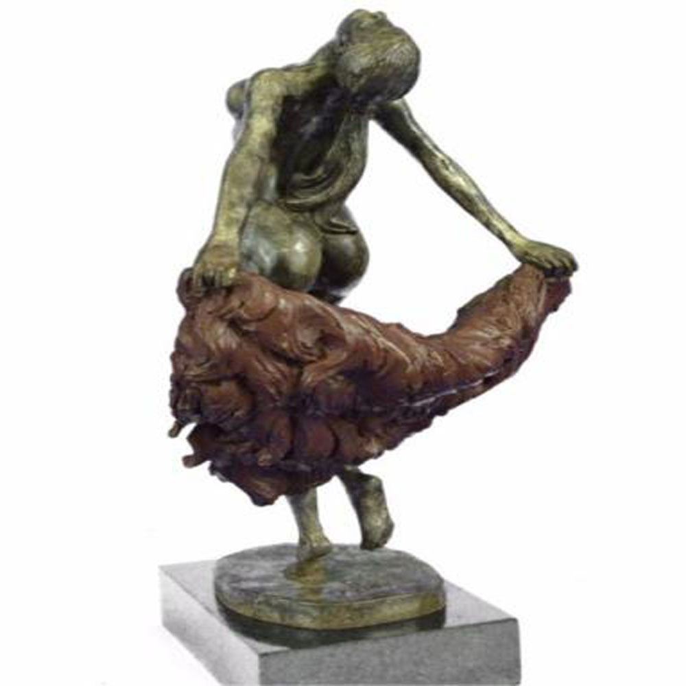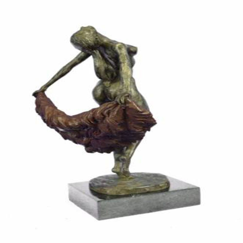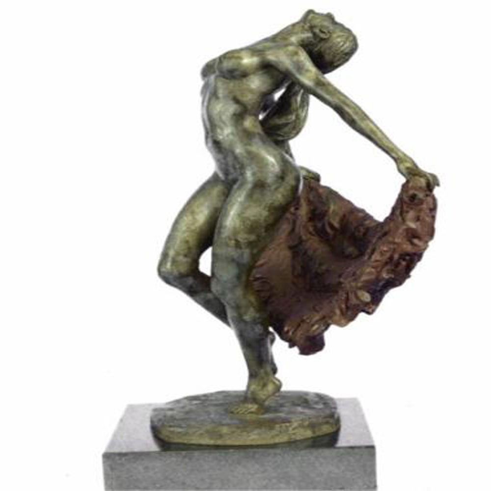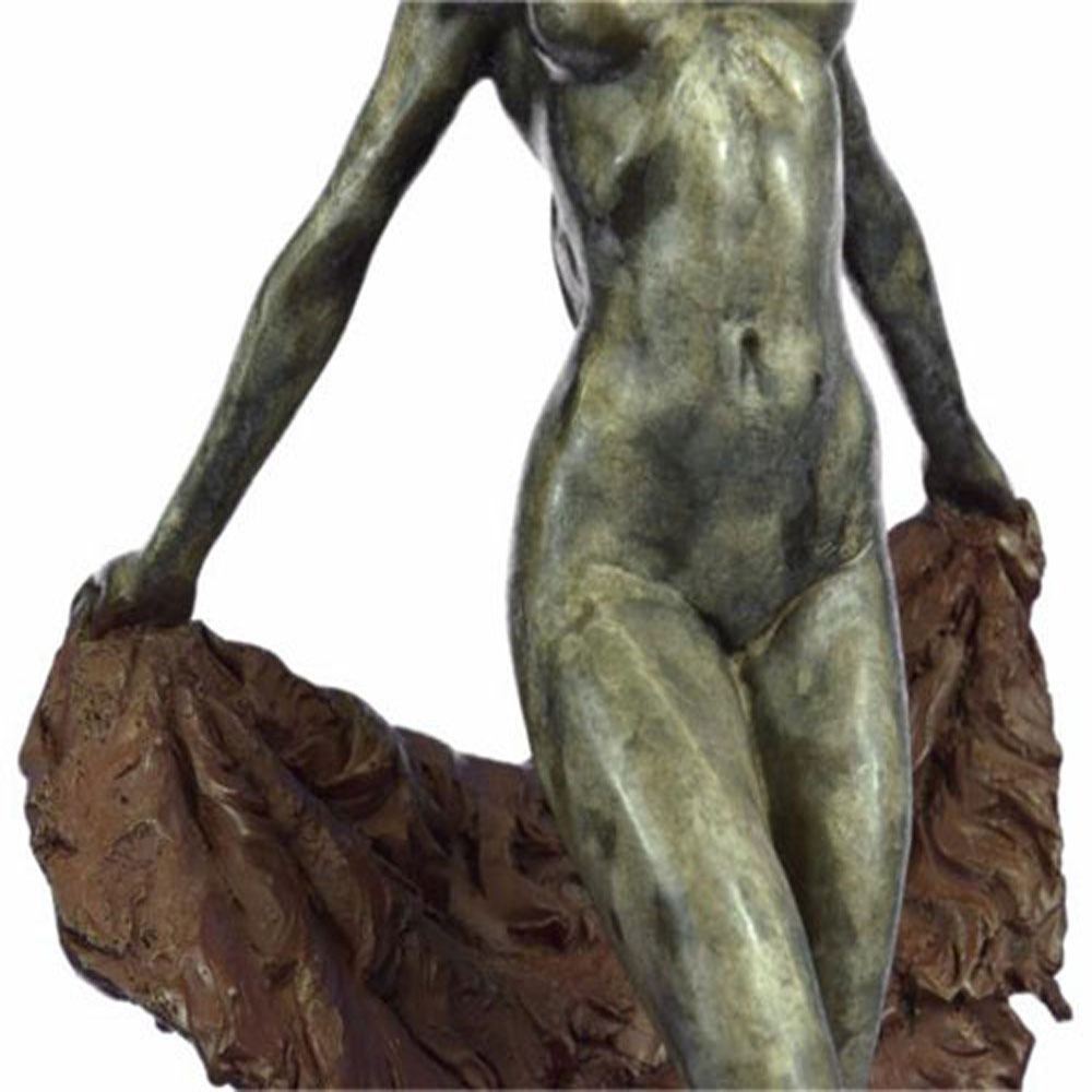 The sexy dancer is seen leaping into the air as a fabric banner, coated in a vibrant red patina, twines itself around her sculpted body. This work of art rejoices the female figure and shows attention to the body under the influence of movement. But most importantly, it’s essence characterizes the spirit within the body that wishes to bound out into everything and everywhere. She was cast using the archaic method of lost wax casting and her skin tone stained with a brown patina finish and is mounted upon a marble base. Bronze Dimensions with Marble Base: Height 15 X Width 9 Inches. Weight: 17 LBS.