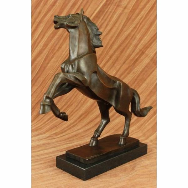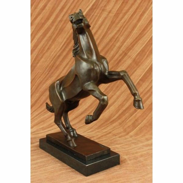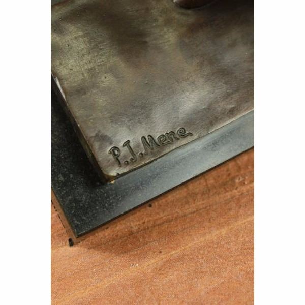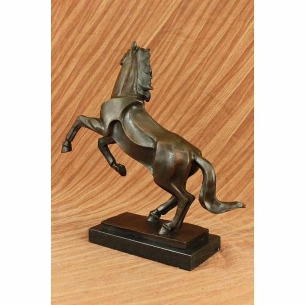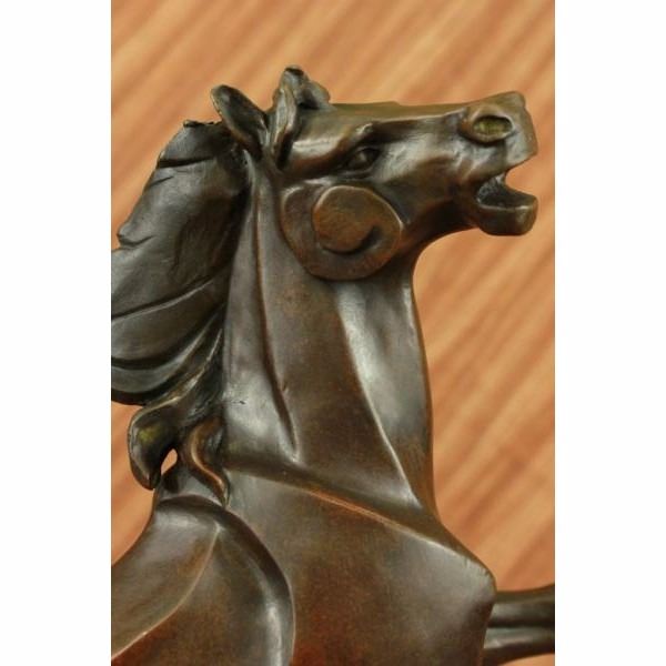 This abstract and modern horse gallops into the wind and rears up letting out a wild neigh as the wind seems pushing against him with a mighty force. This abstract horse captures emotions from the artist and the nature of this wild beast itself. His mane, although not defined, captures the pure energy of movement and shows the force and energy and creativity that is behind this sculpture. His body has fine linear lines that protrude from his side giving him a unique yet desirable look for the abstract theme. His hind legs mesh in to the base creating the support for the sculpture. This sculpture was cast using the "Lost Wax Method" and has a dark brown patina. This sculpture is handmade and is signed P.J Mene. Condition : This sculpture is in perfect condition. Bronze Dimensions with Marble Base:Height 15" x Width 16" Marble Dimensions:9" X 4 1/2" Height without base:14" Weight : 15 LBS Inventory 64Dw1757746