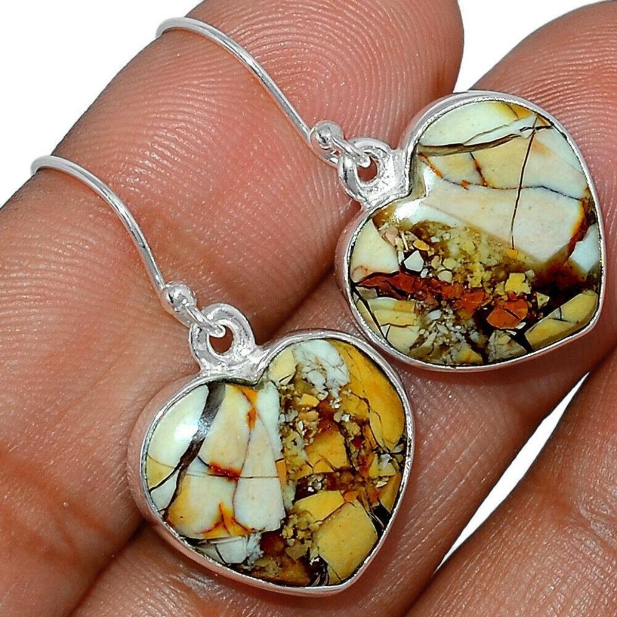 Abstract brecciated mookaite gemstone, carved into the form of two hearts, set into 925 sterling silver hook style earrings.Â