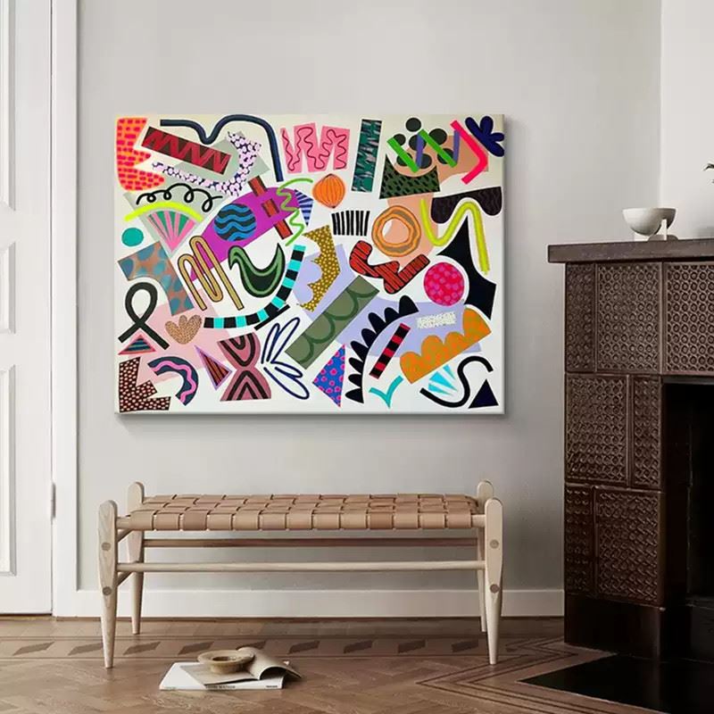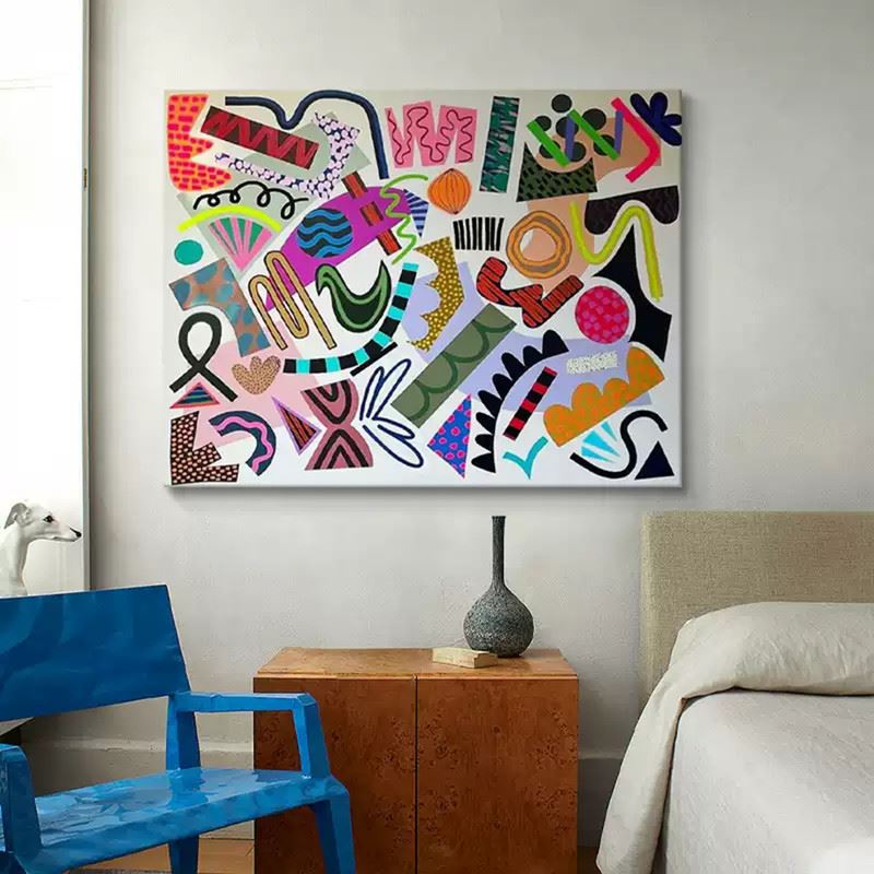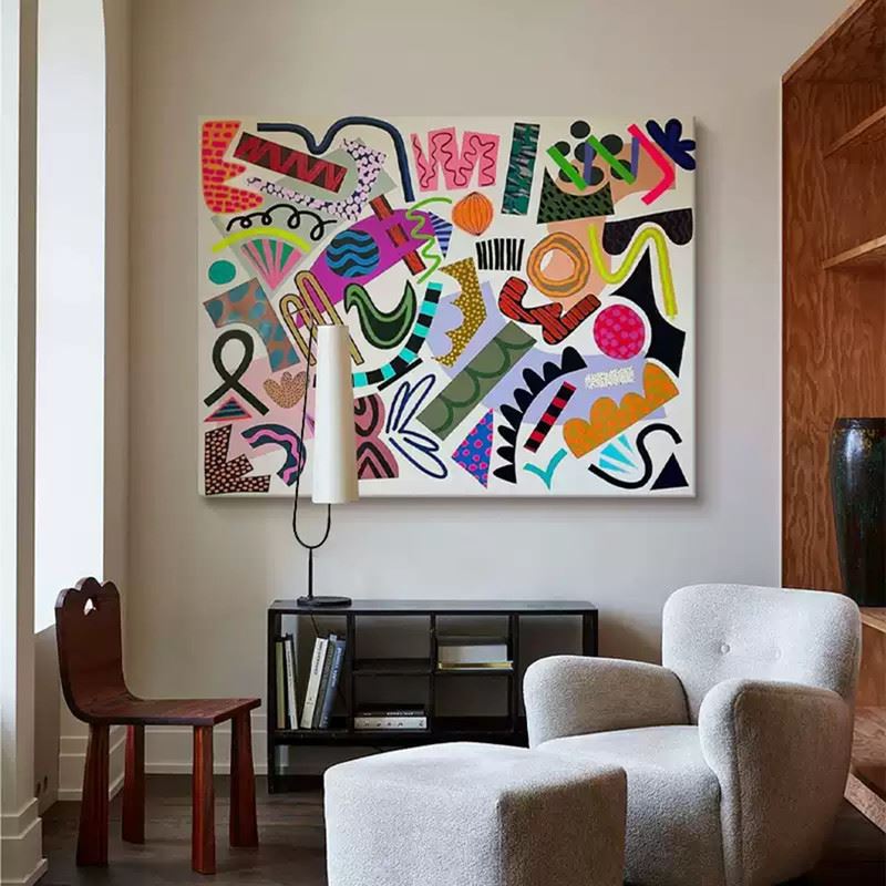This dynamic composition is a burst of vibrant color and playful shapes, blending a variety of patterns, curves, and lines. The bright neon hues and contrasting textures evoke a sense of movement and energy, while the irregular shapes and bold forms create a sense of spontaneity. The piece's fluidity and the freedom in the arrangement of its elements bring together a delightful and bold visual experience. It is a celebration of creativity and the joy of abstract expression. Dimensions: 31 x 24 inches.