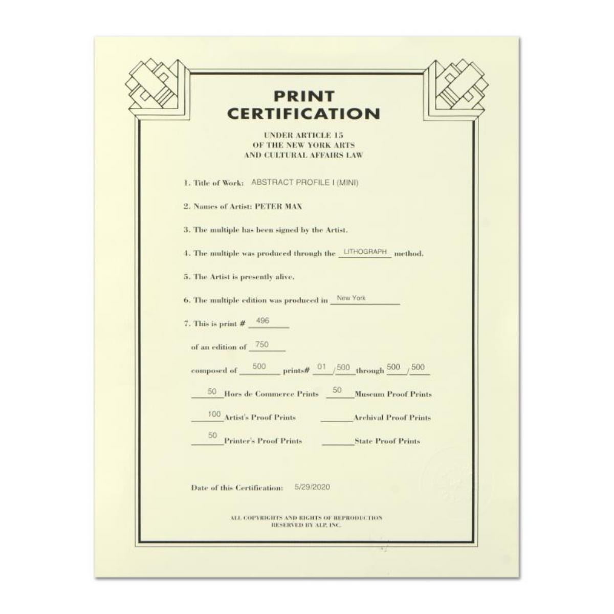 "Abstract Profile I" is a limited edition lithograph on paper by Peter Max, numbered 496/500 and hand signed by the artist. This piece comes framed and includes Certificate of Authenticity. Measures approximately 15.5" x 15" (frame), 3" x 3.5" (image).