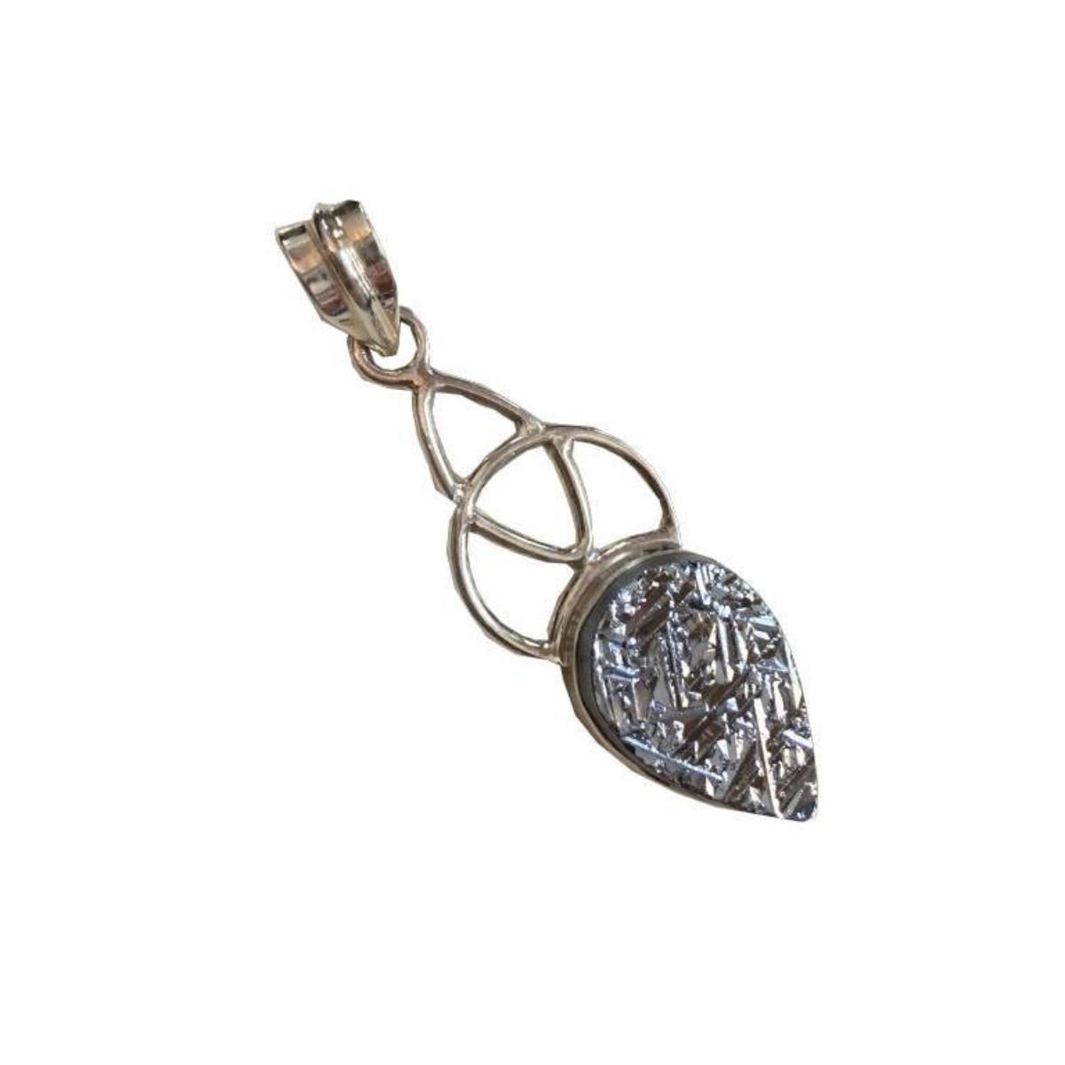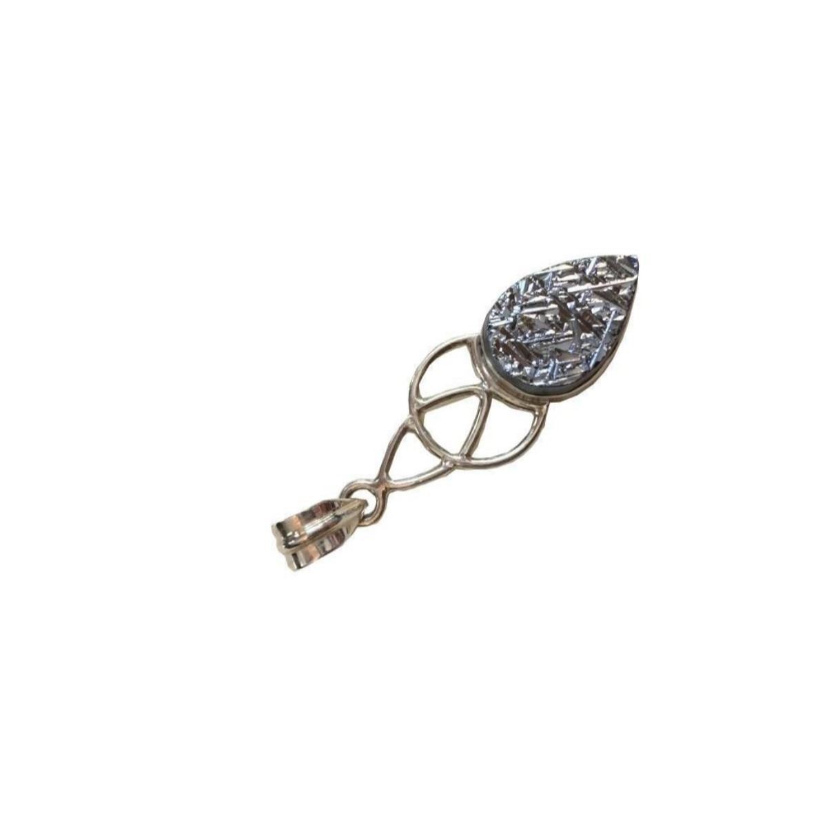 Pyrite or fools gold teardrop shaped slice ( 12mm X 18mm ) set into a modern sterling silver pendant setting. 1 7/8" L X 5/8" W.