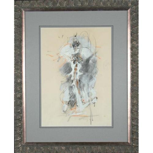 This is an expertly rendered abstract acrylic and charcoal on paper painting. The tones and colors of this painting are a great example of the level of mastery that Bageris has over his paint. The brushwork is very unique and gives the impression of motion. This painting is a perfect balance of quick, dashing and jagged strokes, combined with slow, smooth and curving strokes that meander around the painting in a smooth lackadaisical fashion. It is beautifully framed in a copper colored, ornate wood frame. The color of the wood is a perfect accent to the tones of gray in the painting. ...