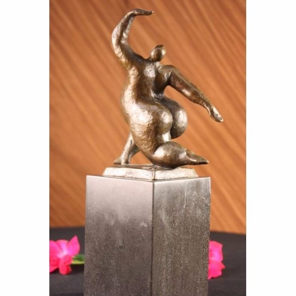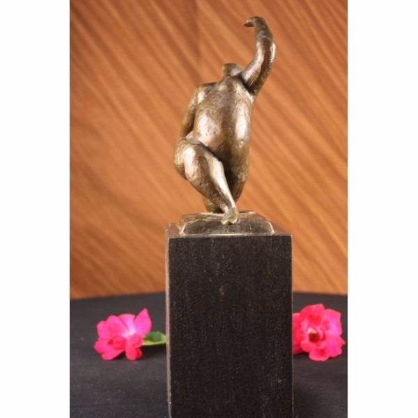 An abstract beauty poses for a portrait. She stretches her long round body. She kneels and curls an arm upward. Like a classic pin-up, she pushes her chest out, tilts her head up and is ready for her close up. This brown patina sculpture was cast using the lost wax method and mounted on a marble base. Bronze dimensions with marble base: Height 11 X Width 5 inches. Weight: 9 lbs.