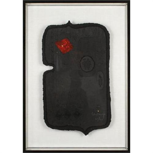 This outstanding work of art is full of textures and shapes that create a uniquely composed artistic expression. The mastery of form that Lebadang displays through this work is both brilliant and creative. His distinctive technique is exhibited through this breathe taking work of art. This piece is framed in a black metal three dimensional case that sets the primarily black artwork on a white fabric background which helps to accent the art. The entire piece, including frame, measures 31? x 21.5?. This is a beautiful work of art at an outstanding price and is accompanied by a certificate of authenticity.