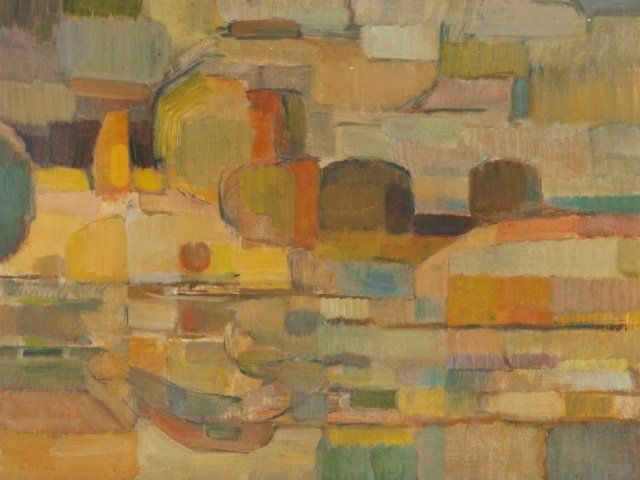 Abstract landscape composition in yellow, green, and orange hues. c. 1950s. Signed on reverse stretcher, "Monson". 18" x 24". Frame: 23 1/2" x 29".